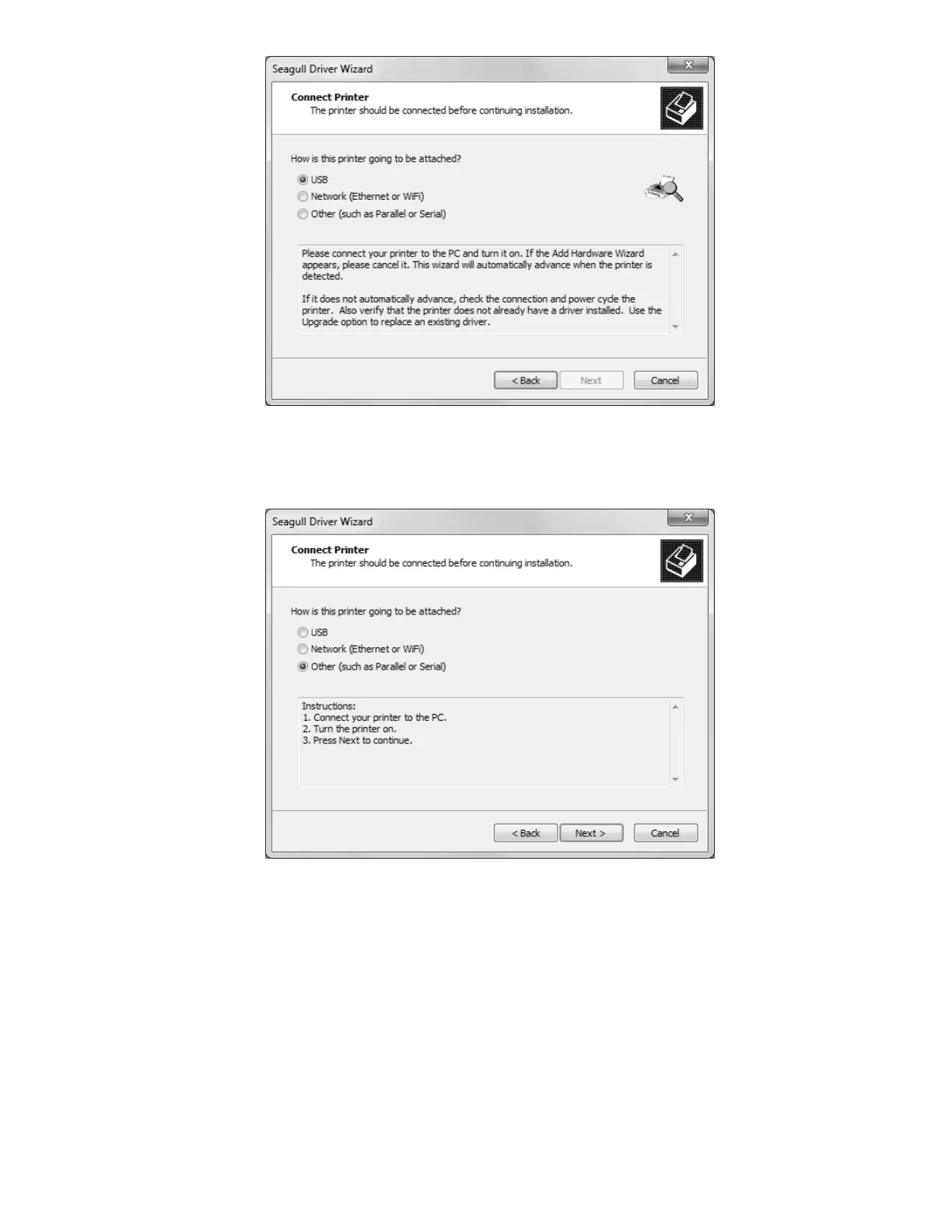 By default, when you reach the “Connect Printer” screen, USB will be selected. It is advised