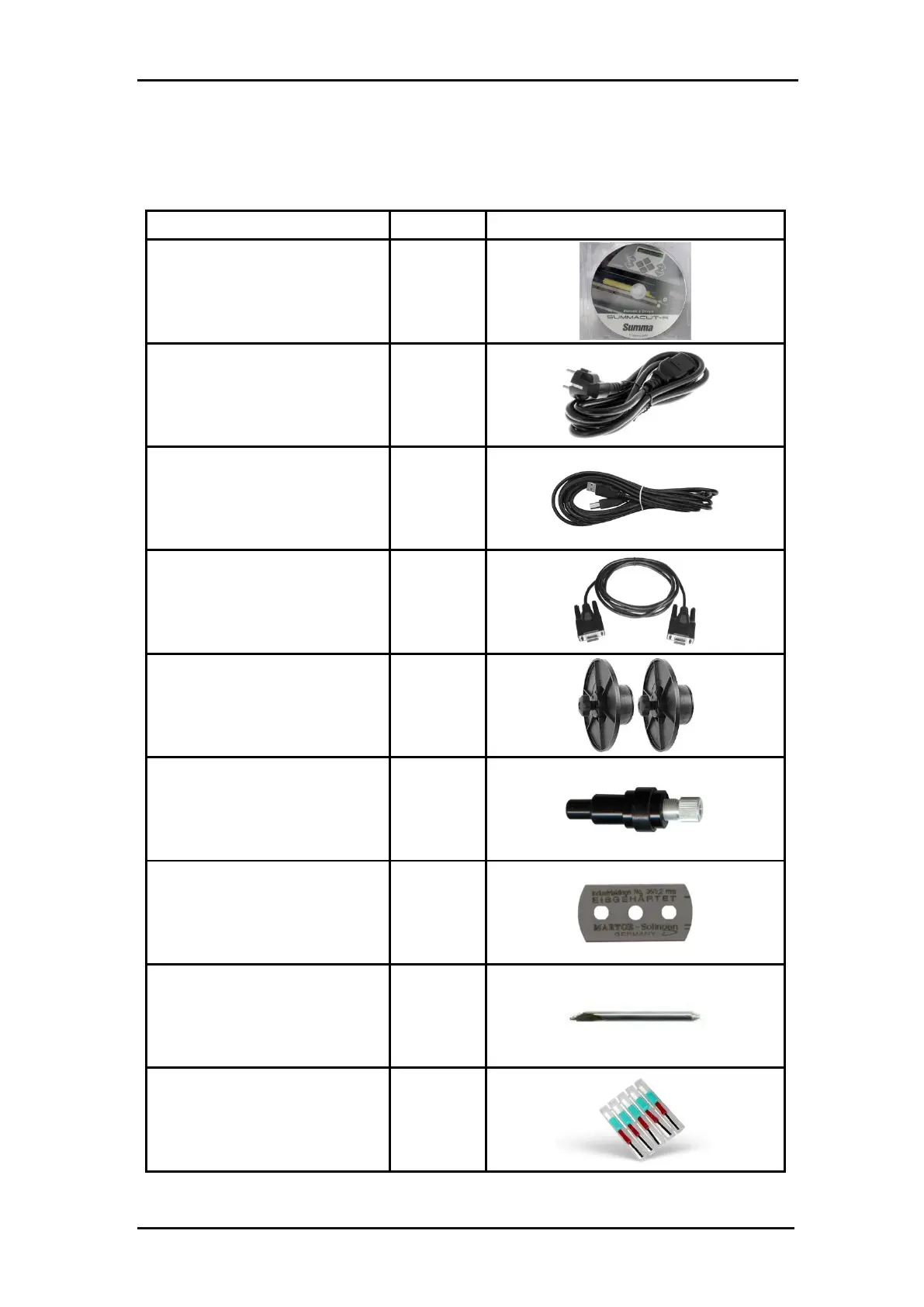 The following chart contains descriptions and part numbers for the SummaCut
