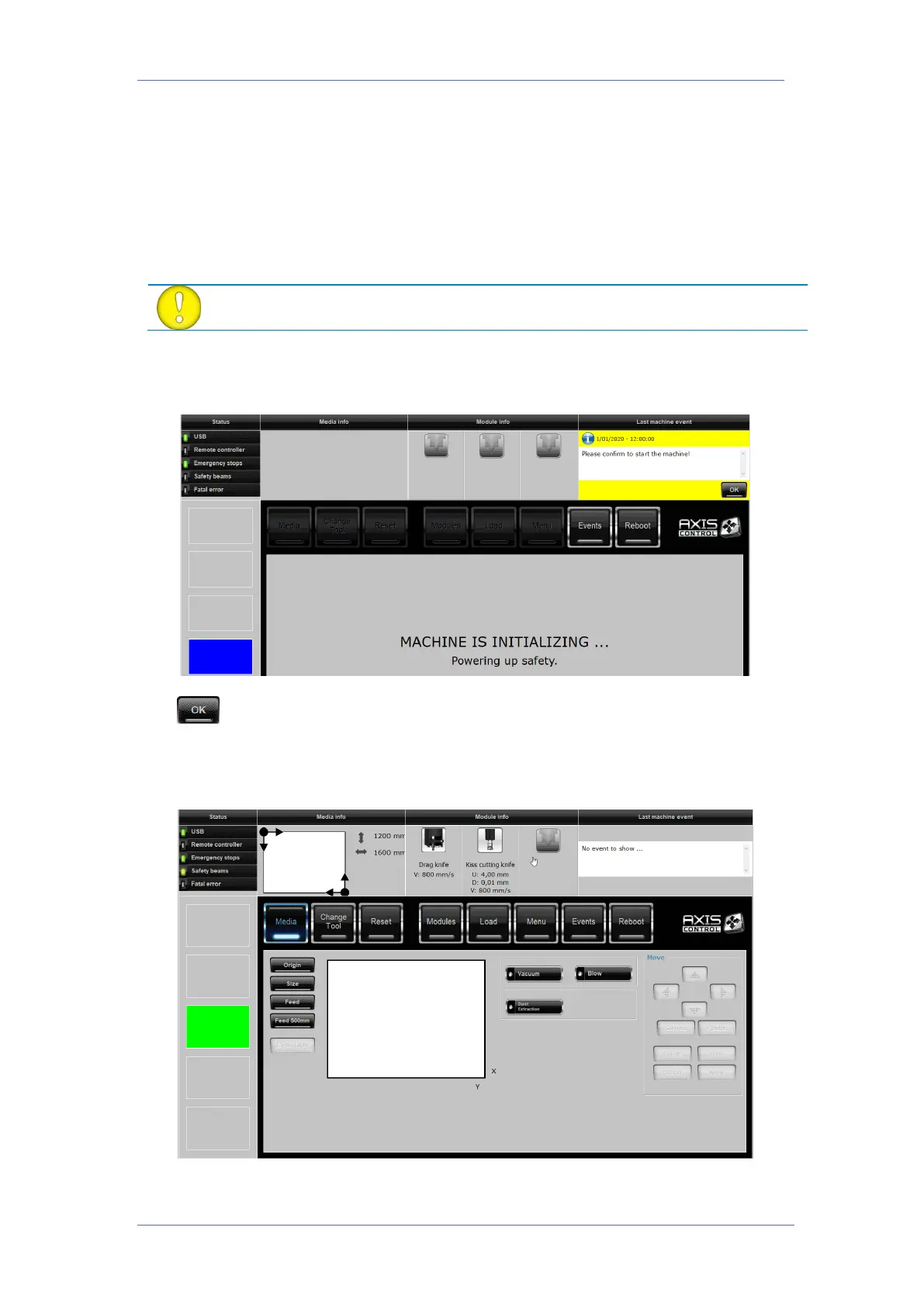 Click to proceed with the startup sequence. In the next step the emergency buttons will