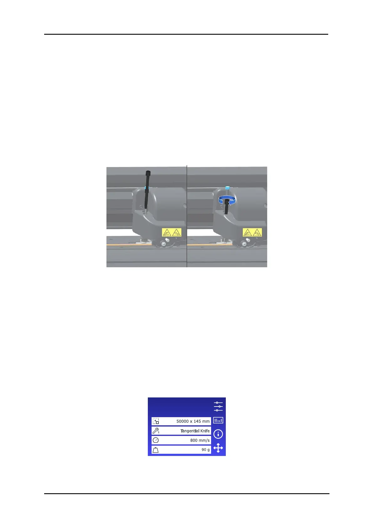 a tangential knife is loaded, set to cut at a speed of 800 mm/s with a pressure of 90 grams.