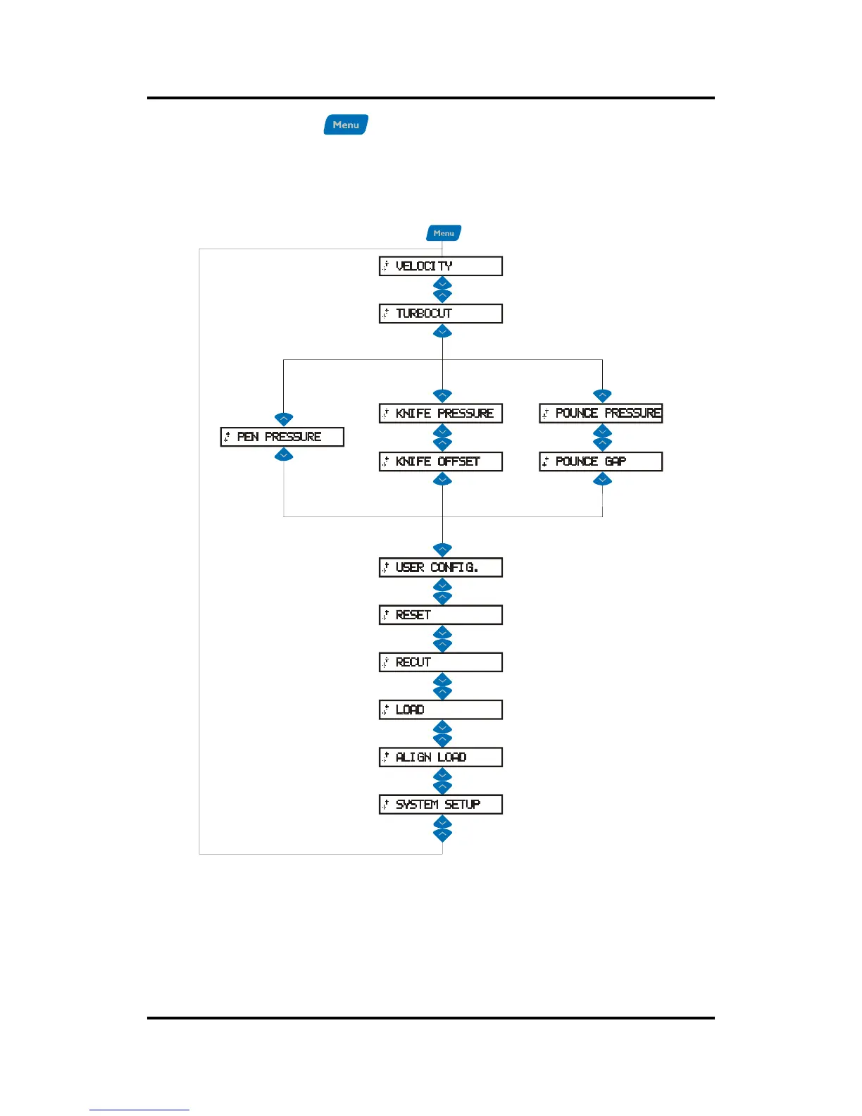 The Menu key is used to reach the most common menu items of the cutter quickly. A