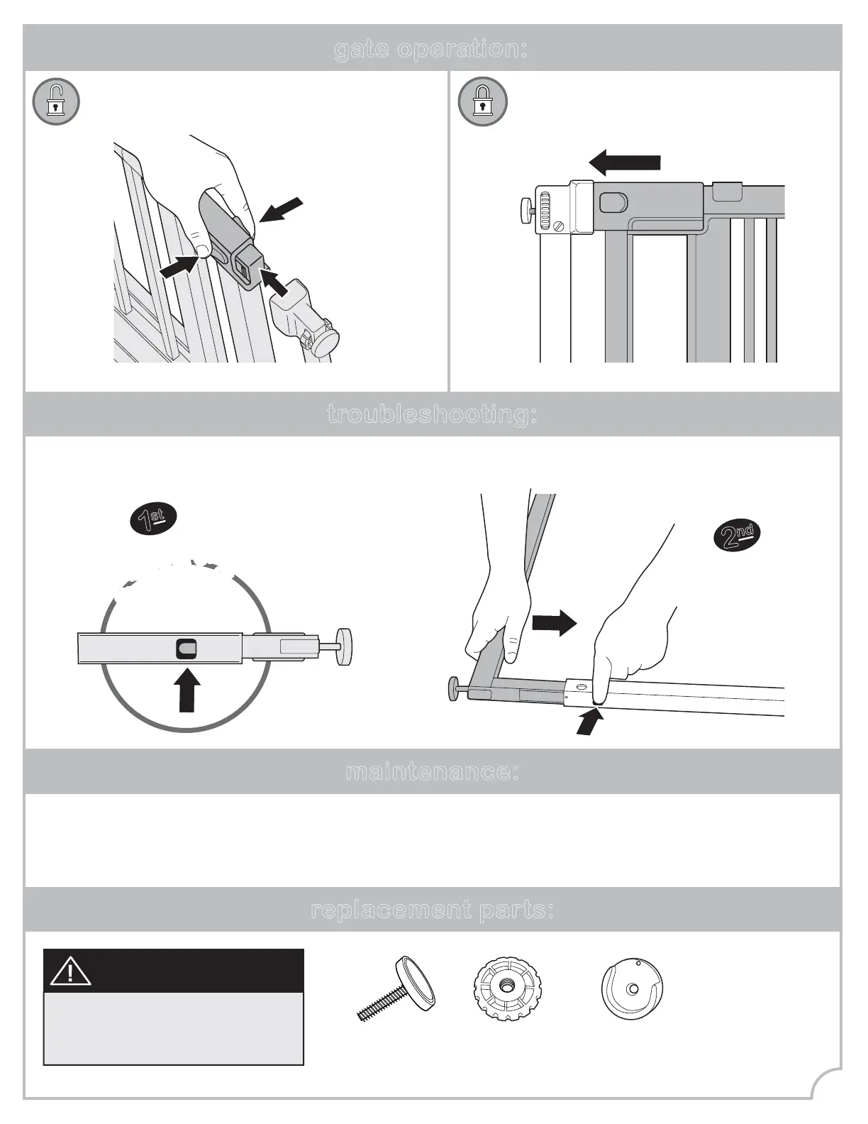 • Check all hardware to ensure gate is securely in place before each use.