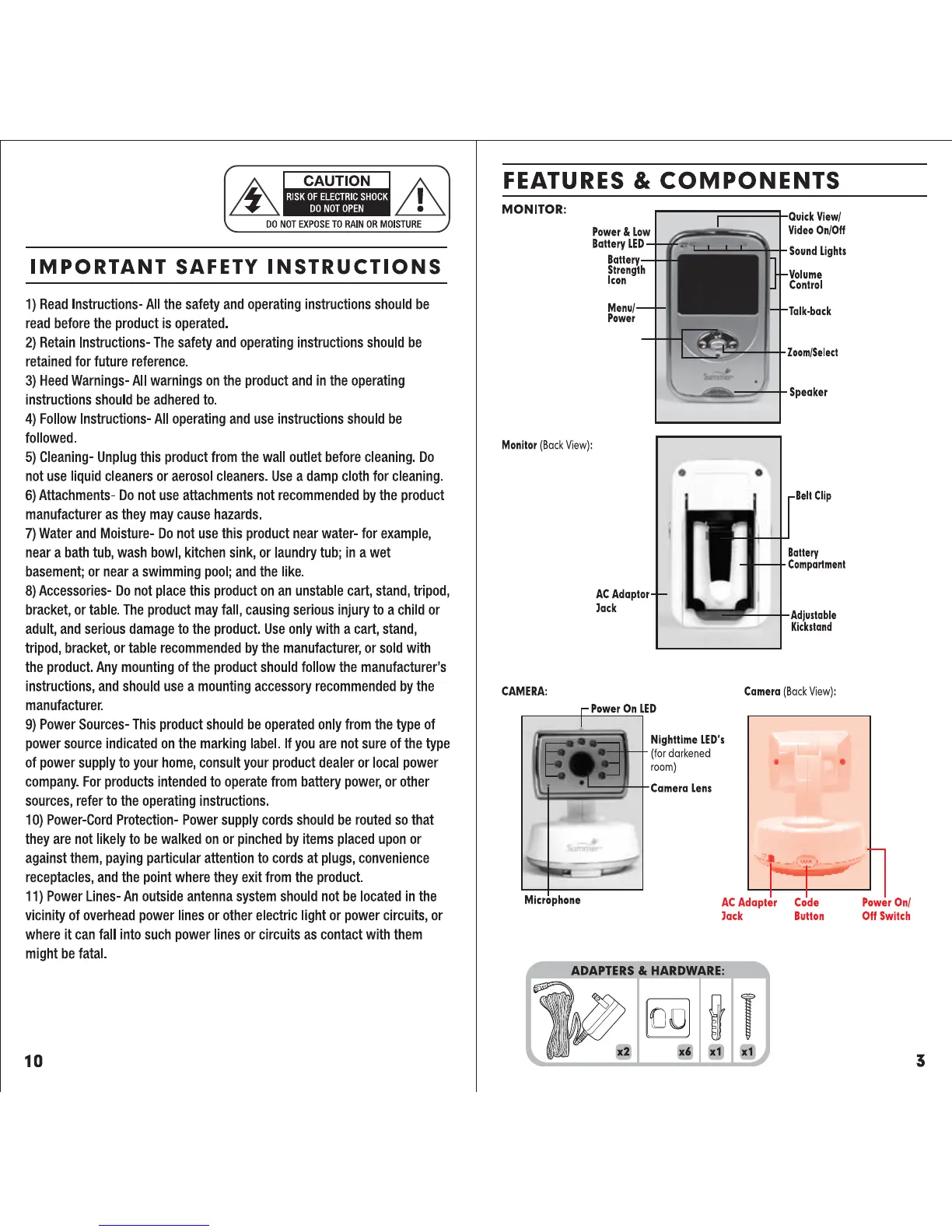 Summer 28820 - General Safety Precautions; Electrical Shock and Environmental Warnings; Operating and Handling Instructions; Product Features and Components