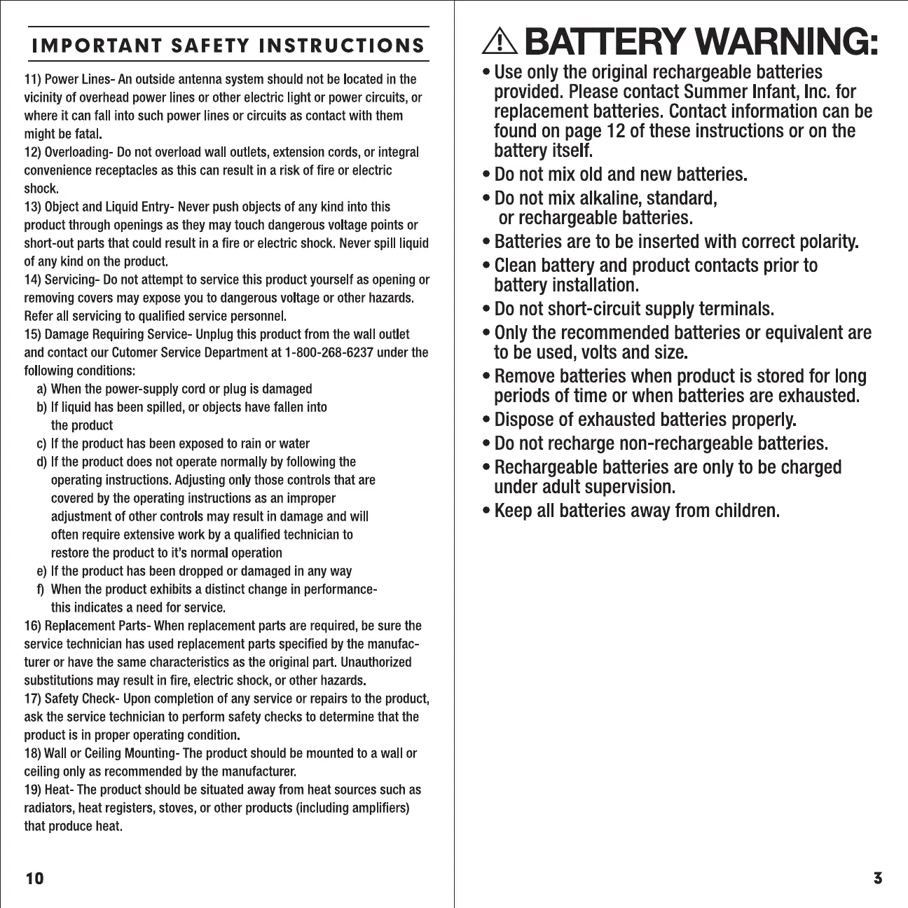 Summer 29030 - IMPORTANT SAFETY INSTRUCTIONS; Power Line and Overload Safety; Object Entry and Servicing; Battery Safety Warnings
