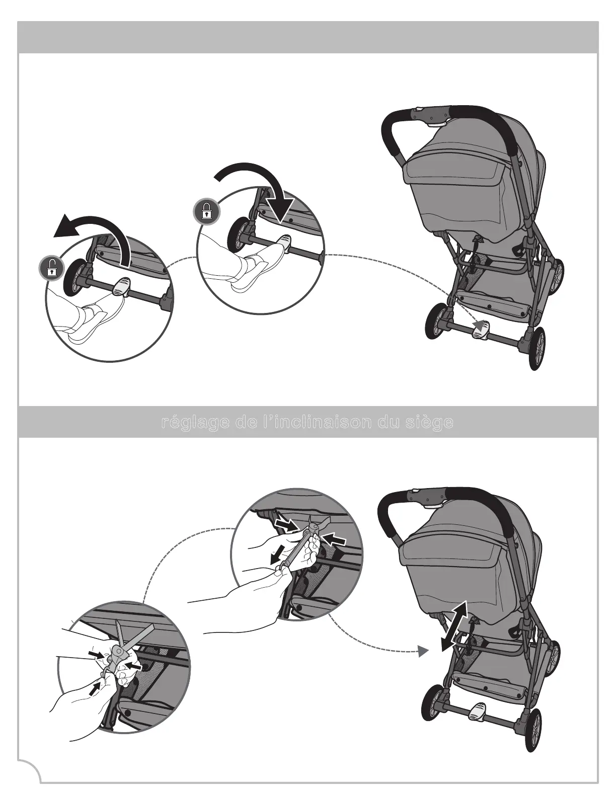 Serrez la pince d’inclinaison du siège au dos de la poussette et tirez ou poussez la