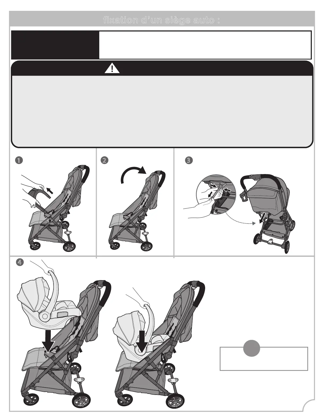 • NE JAMAIS installer un siège auto pour bébé sans le fixer solidement à la poussette à l’aide des sangles du siège