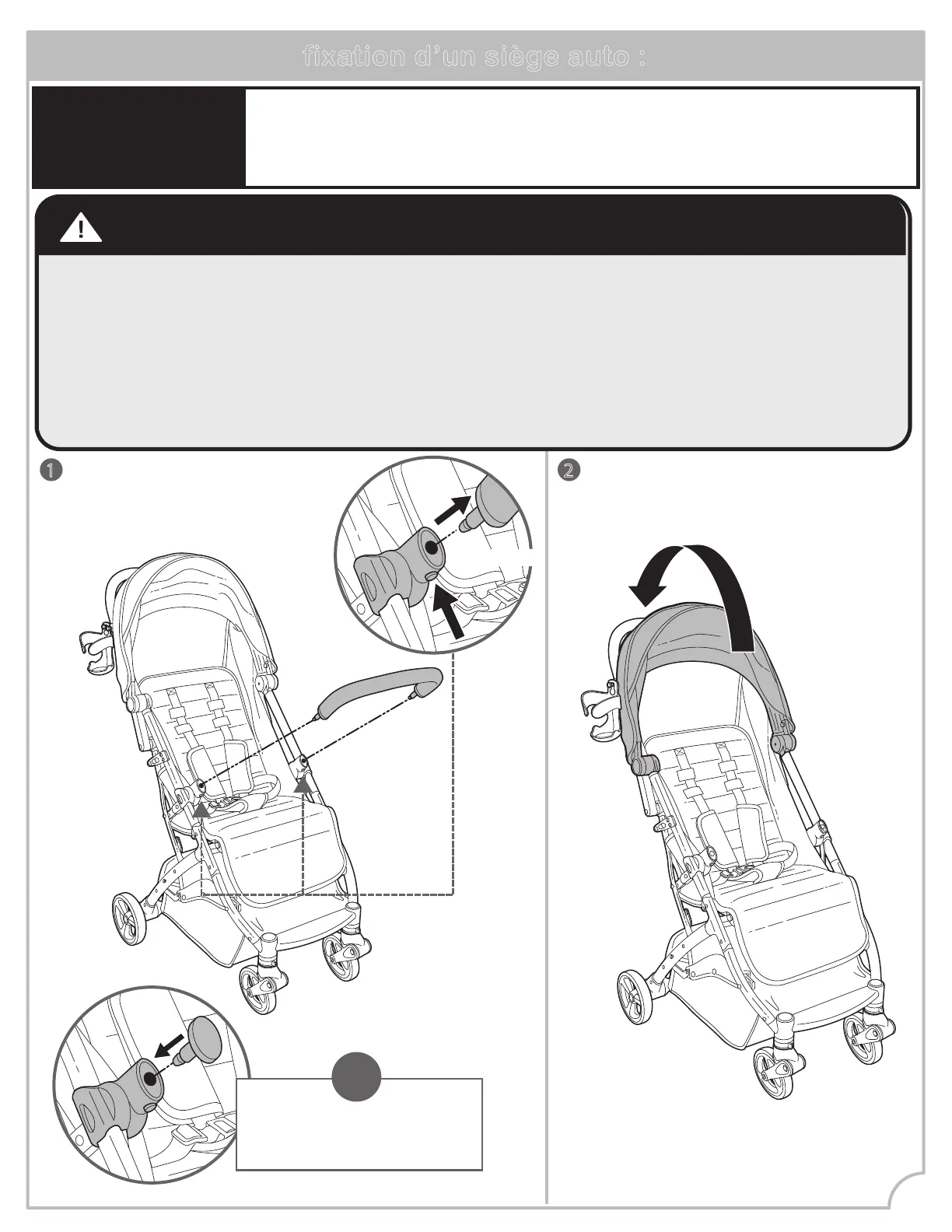 • NE JAMAIS installer un siège auto pour bébé sans le fixer solidement à la poussette à l’aide des sangles du siège