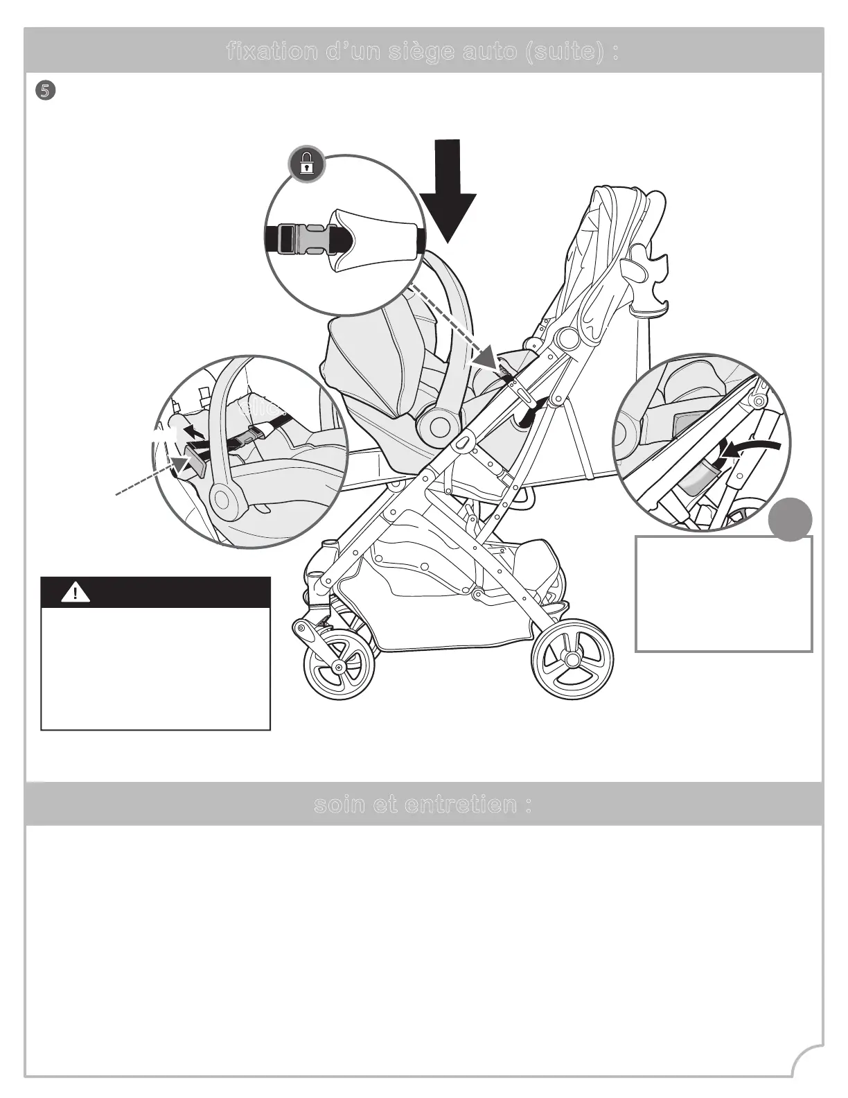 Placez les deux sangles du siège auto, attachées aux rails de la poussette, dans les