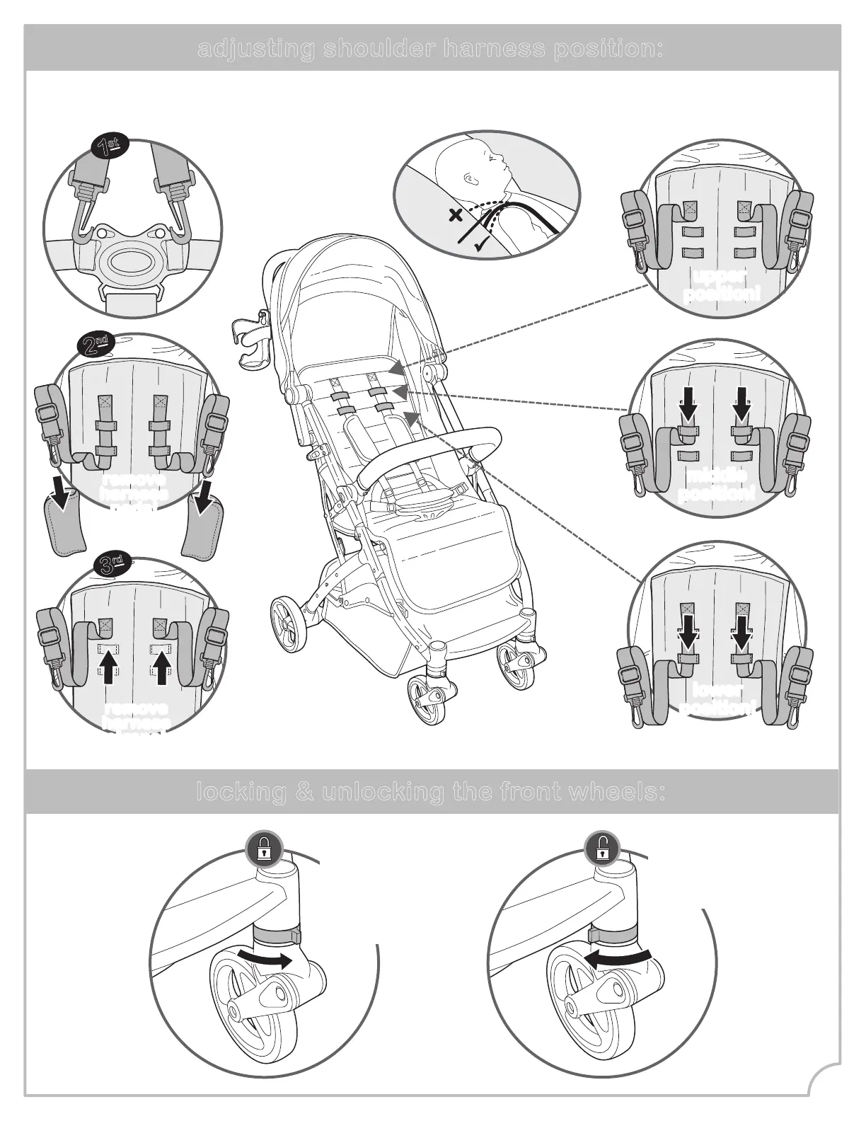 Summer 3Dpac CS+ - Adjusting Shoulder Harness Position; Wheel and Brake Control; Front Wheel Locking Mechanism