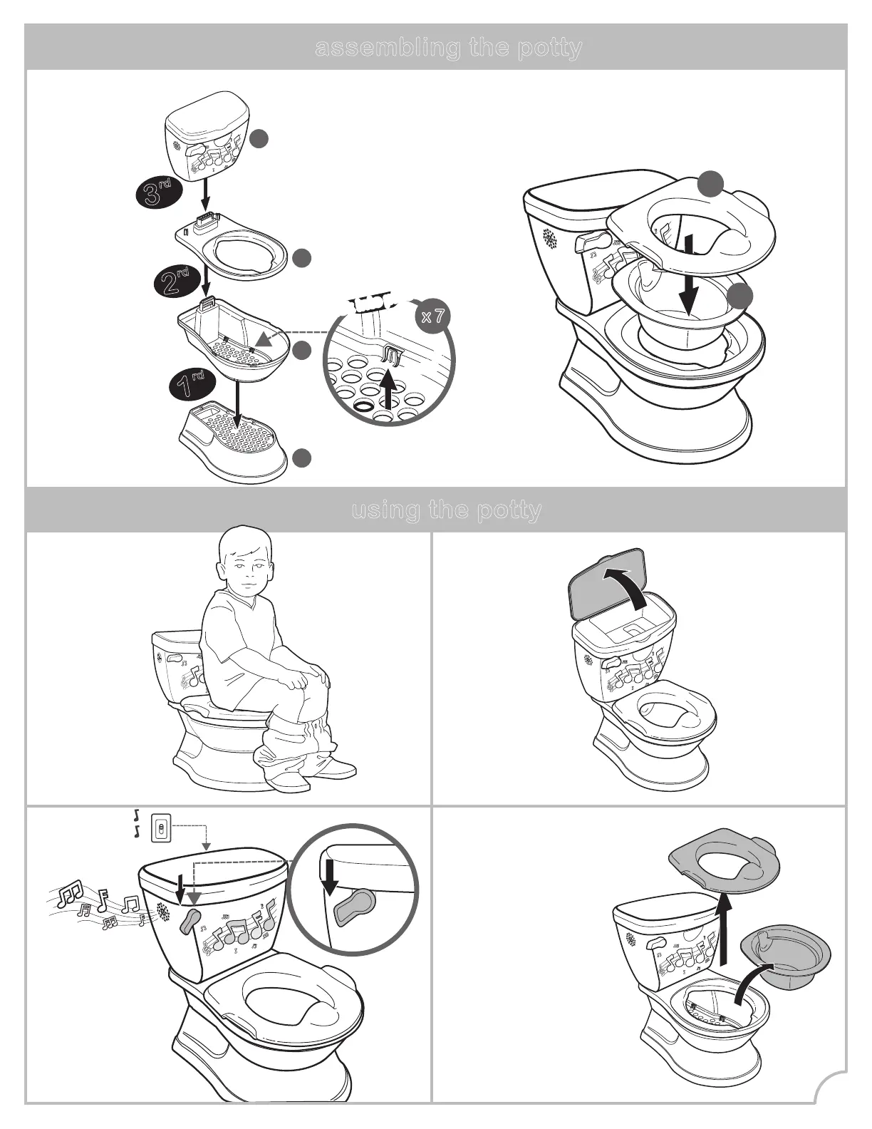 Summer My Size - Potty Assembly and Usage; Step-by-Step Assembly Guide; Proper Placement and Seating; Lights & Songs Feature Operation