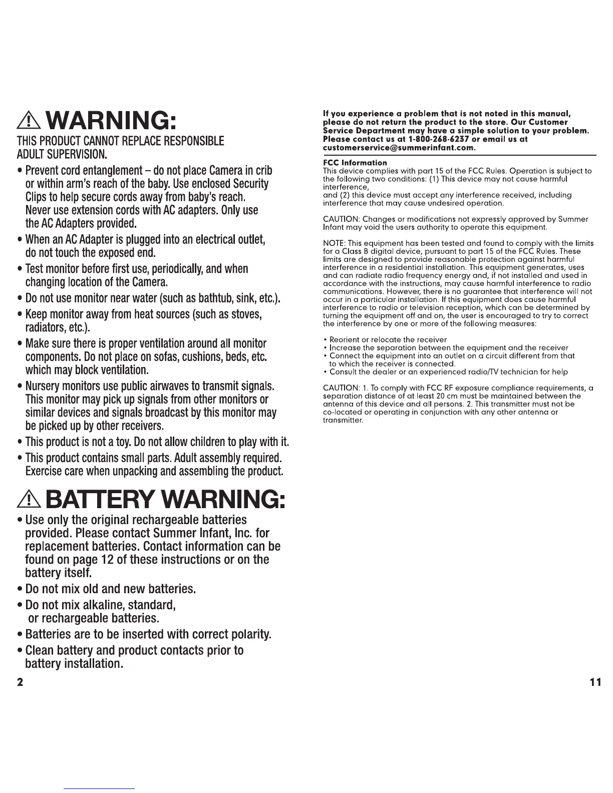 Summer Secure Sight - Important Safety and Regulatory Information; General Adult Supervision and Usage Warnings; Battery Handling and Safety; FCC Compliance and RF Exposure