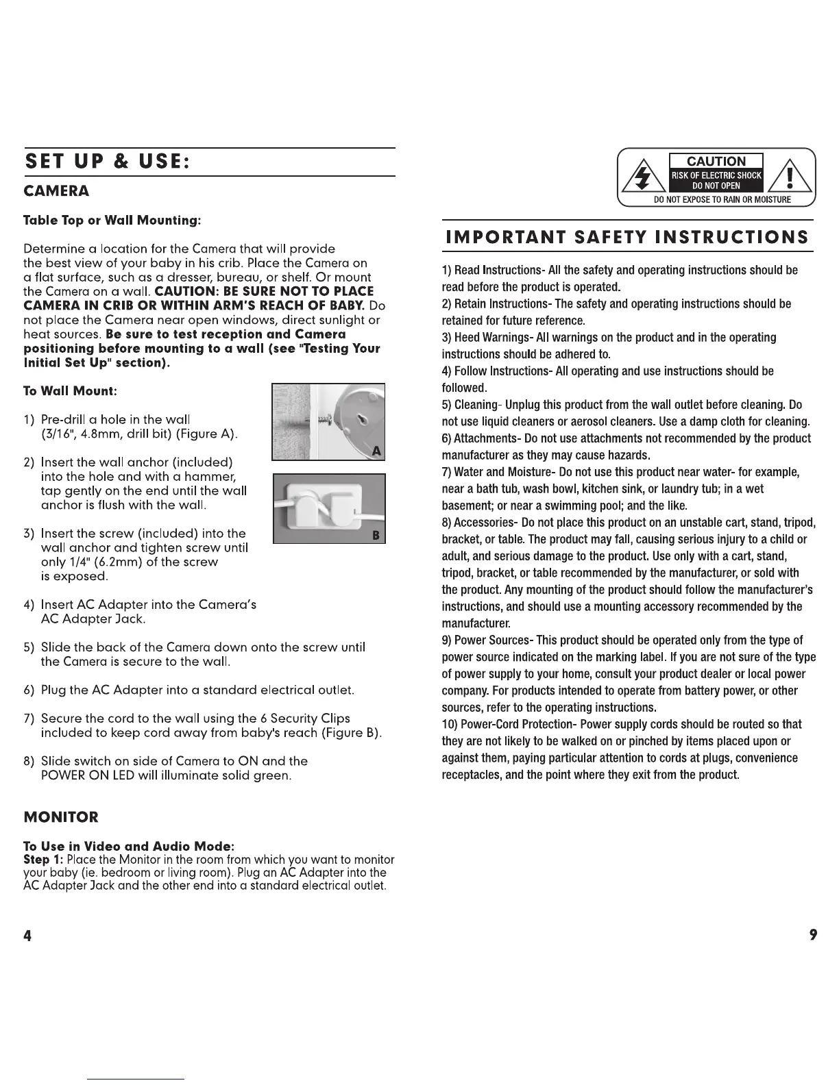 Summer Secure Sight - Camera Setup and Mounting; Table Top or Wall Mounting; Monitor Setup for Video and Audio