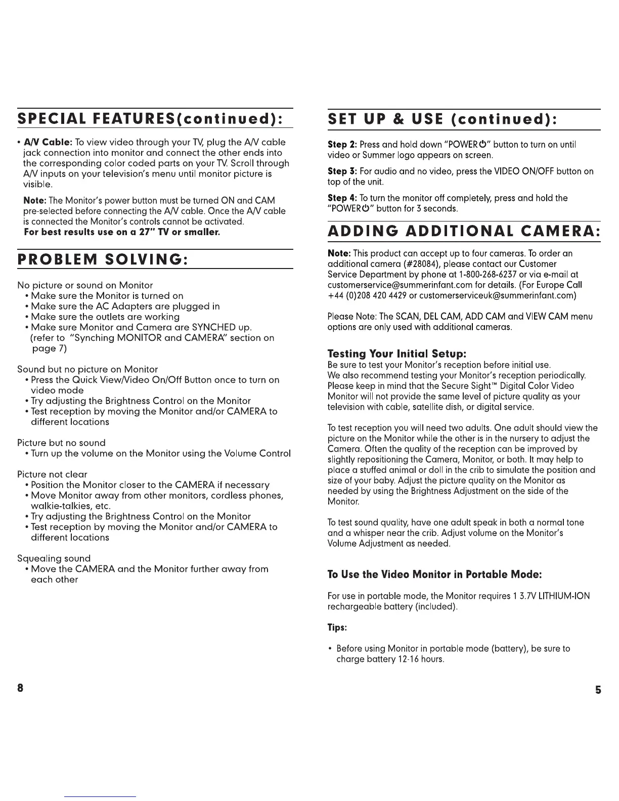 Summer Secure Sight - Setup and Use; Connecting the A;V Cable; Troubleshooting Common Issues; Adding Additional Cameras