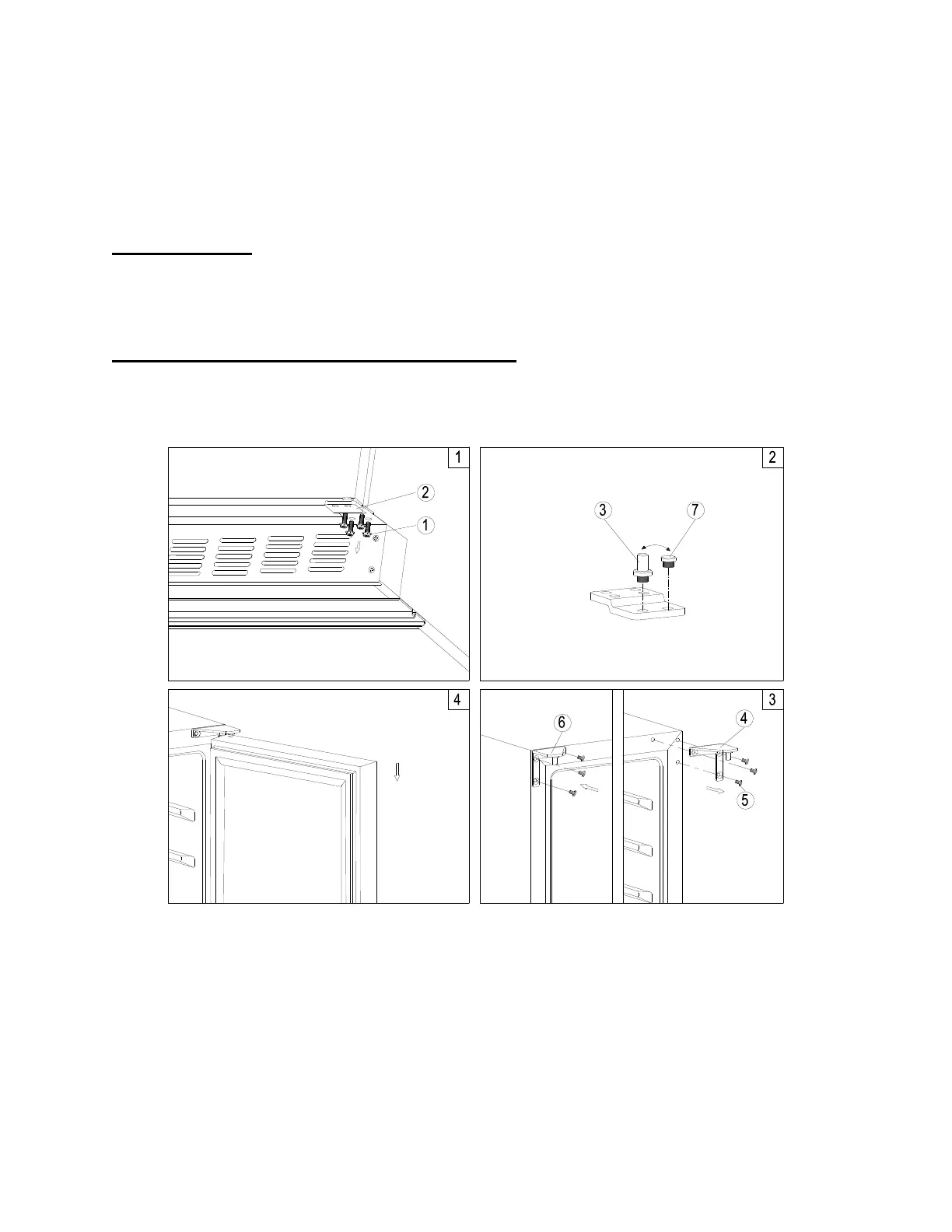 1. Remove the bottom hinge (2) by unscrewing the four lock screws (1). Be careful to hold the door
