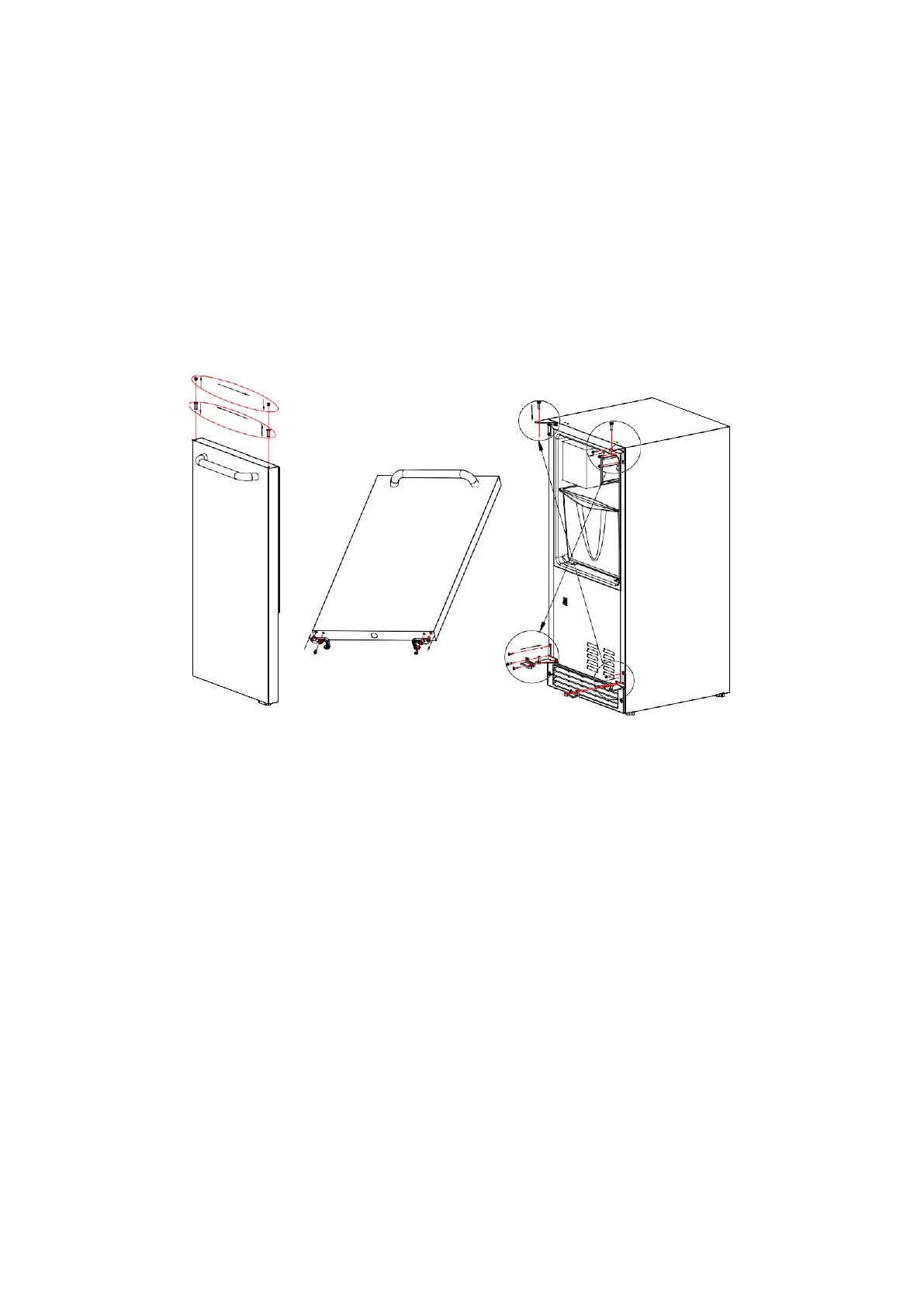 Install the door on the bottom hinge, and then install the top hinge axis. Tighten the screws firmly.