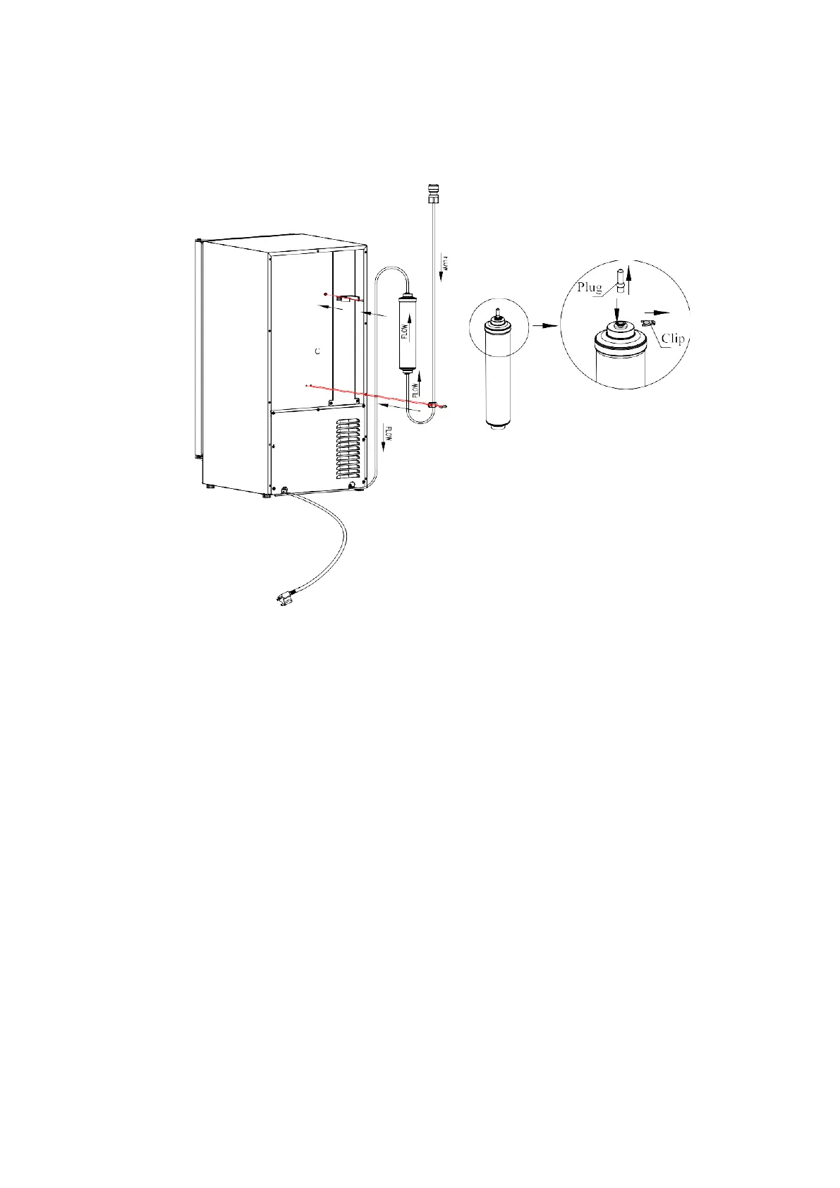 inserting the water supply tube to the inlet end of the filter. Reinsert the clip to lock the tube.