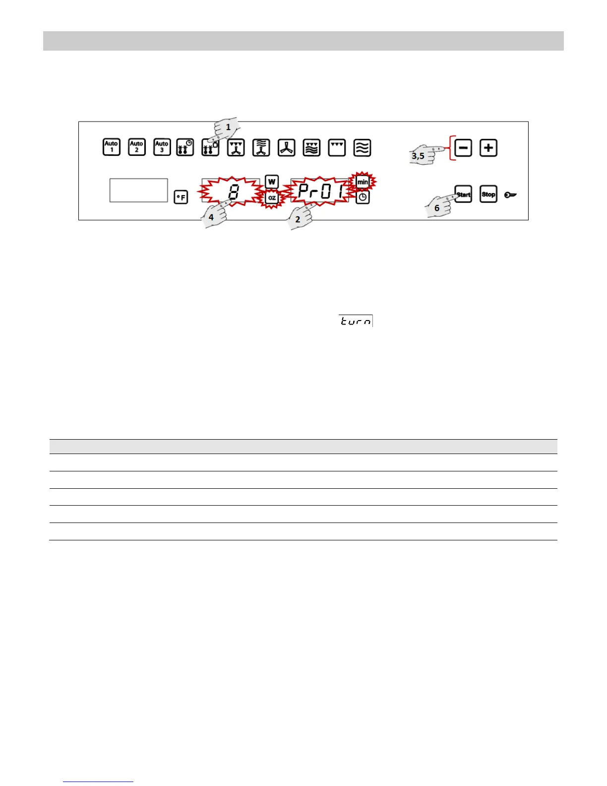 The following table shows the defrosting by weight function programs, indicating weight intervals, and