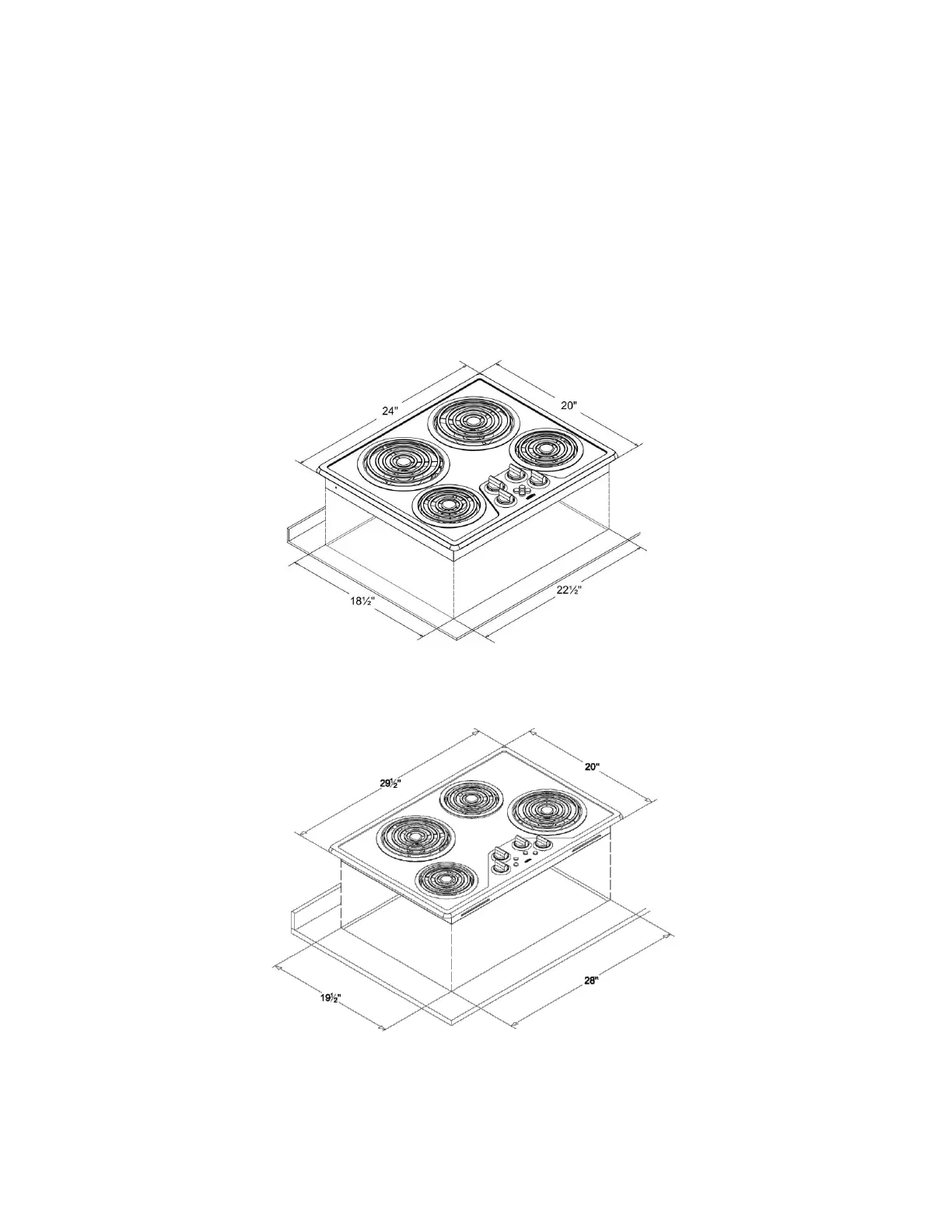 Cooktop dimensions and countertop cutout dimensions are shown below: