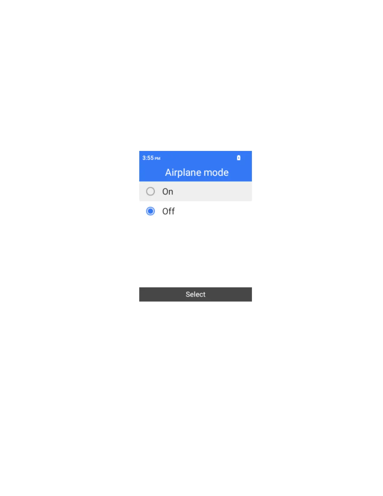 Select O to turn Airplane mode on . When Airplane mode is on, Wi-Fi, mobile networks and