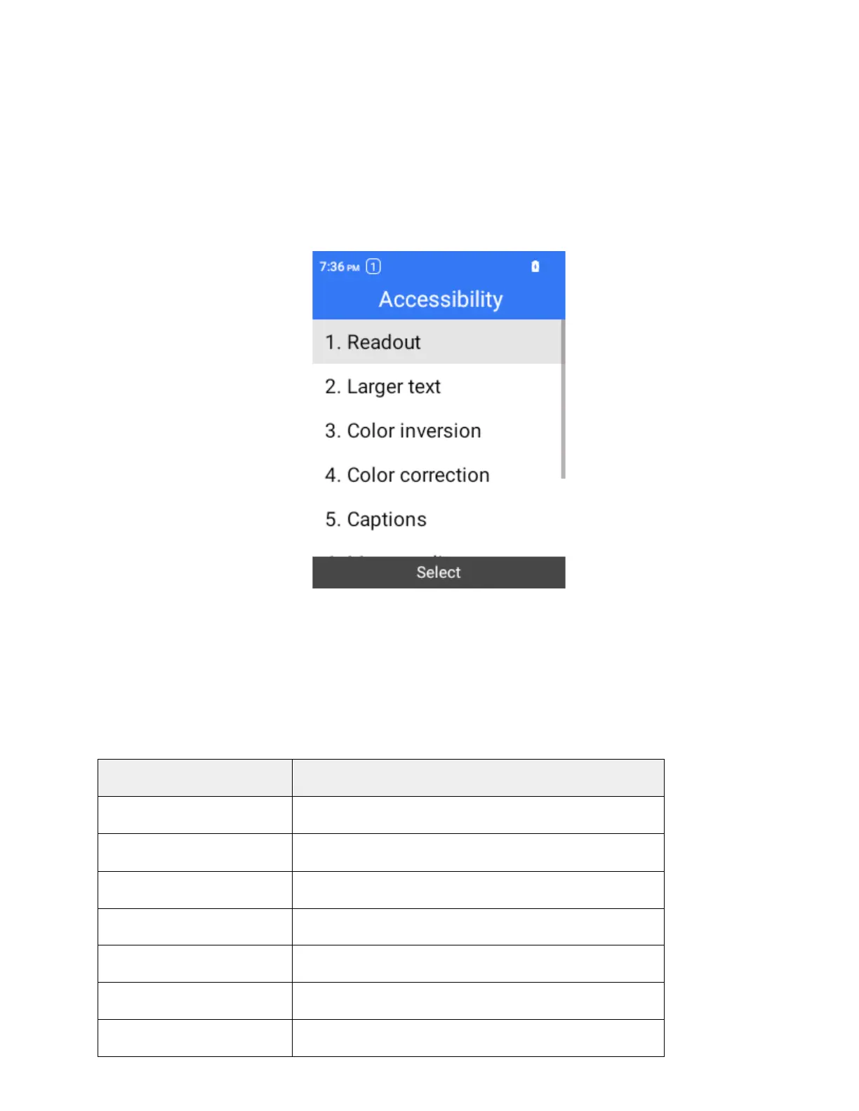 The accessibility settings menu allows you to configure the following options. Select individual options to