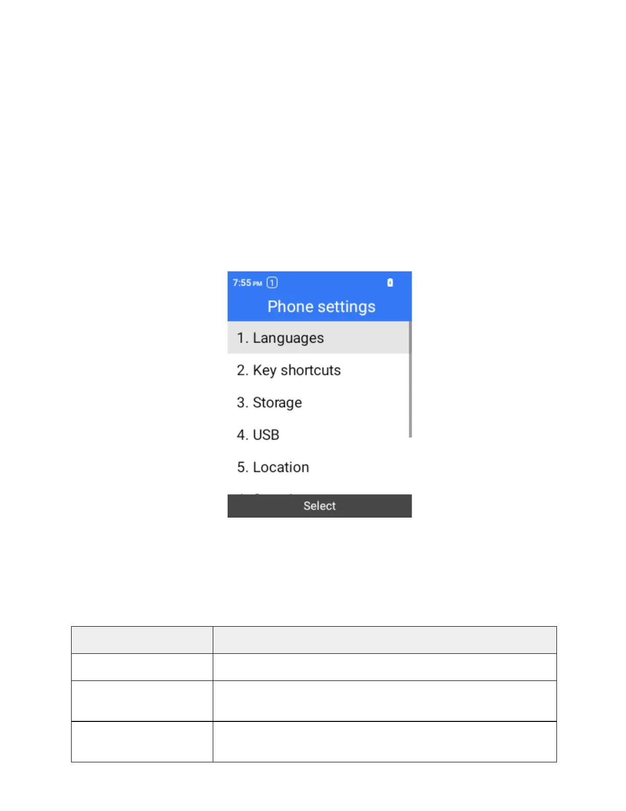 The phone settings menu allows you to configure the following options. Select individual options to access