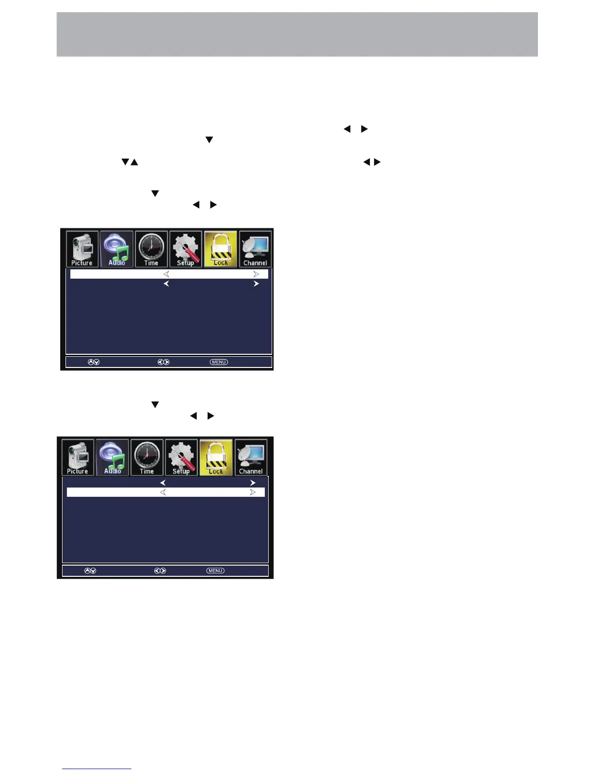 Press the MENU button on the remote control. Navigate using arrow buttons to select Lock. Gain access to