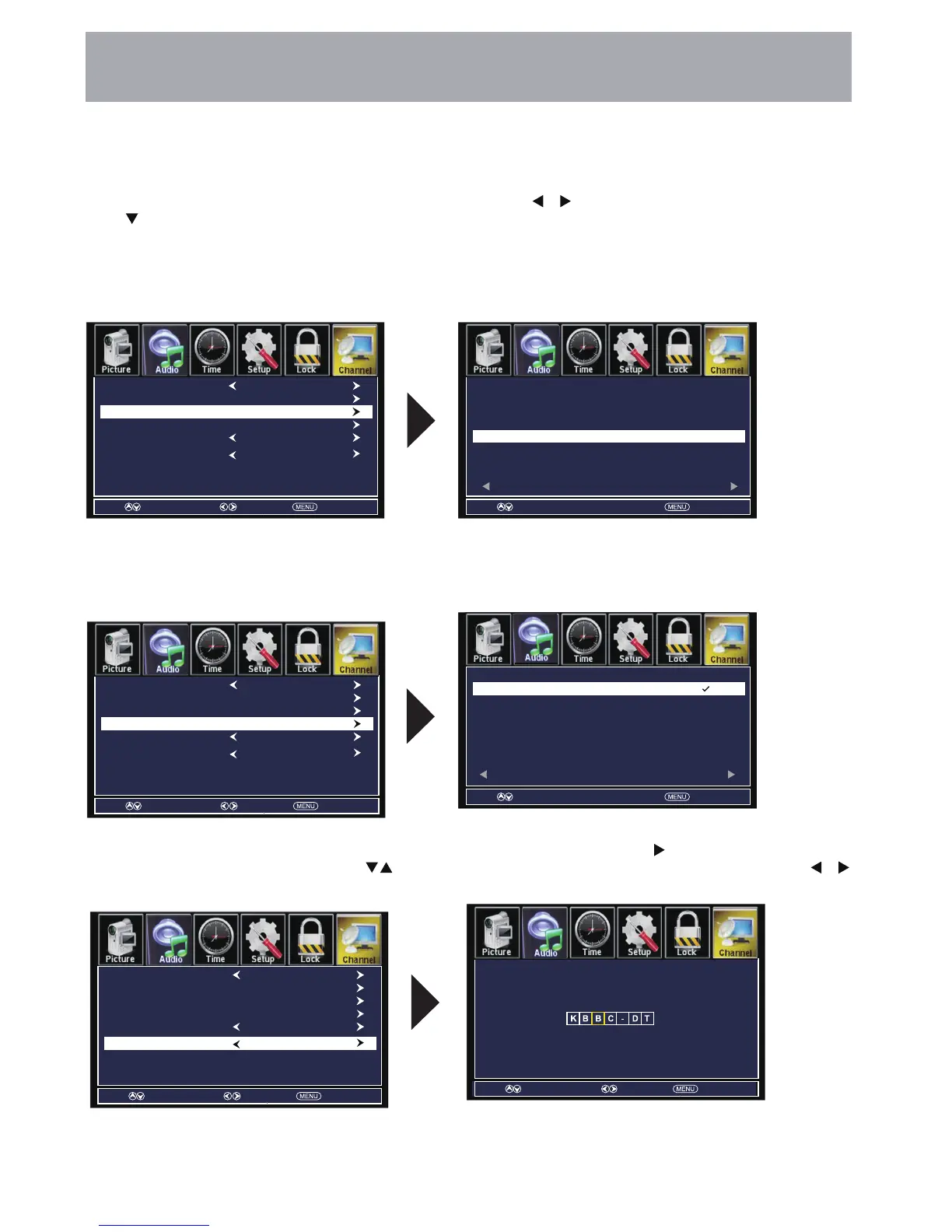 screen menu to relabel a channel. Use the arrow buttons to spell out each letter, number or character. Use