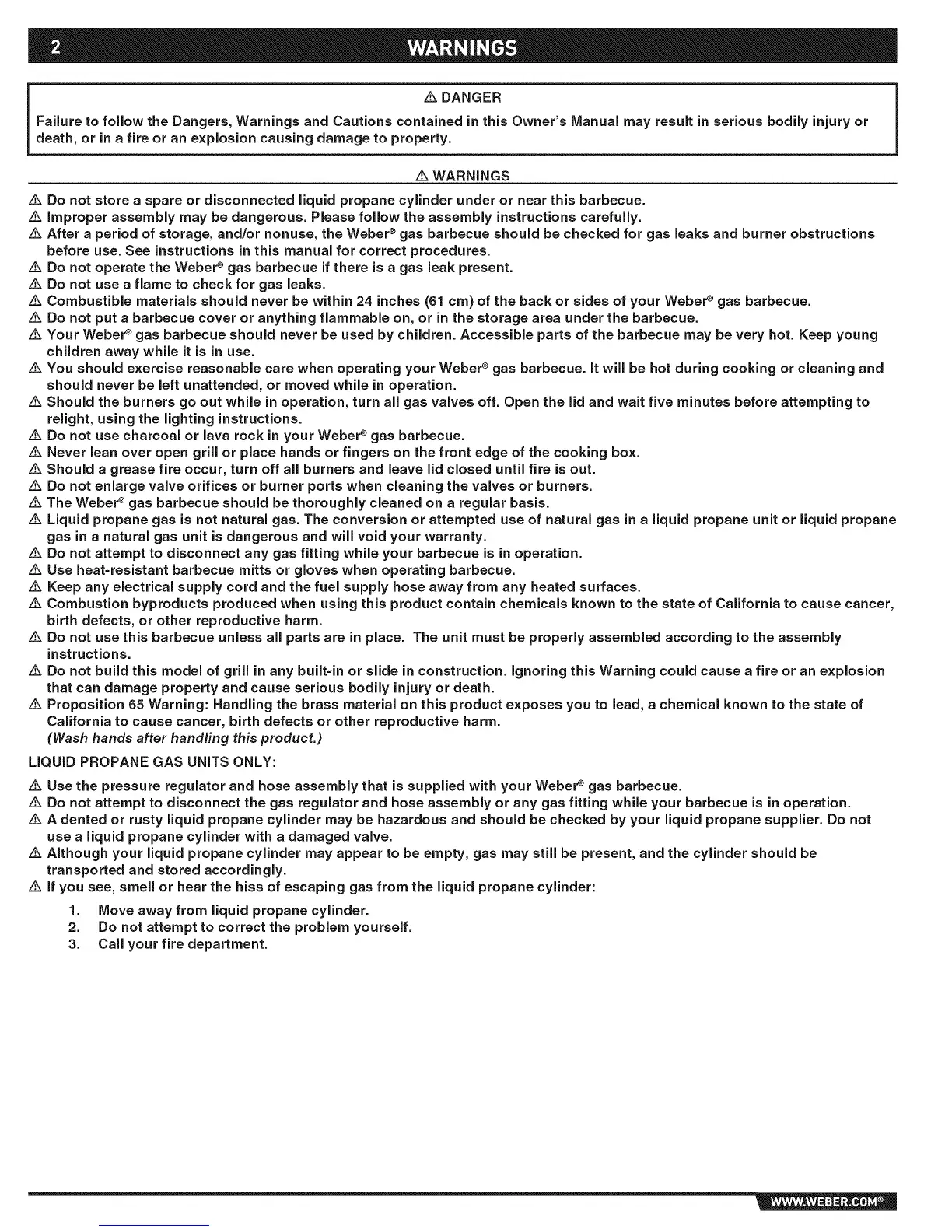 z_ After a period of storage, and/or nonuse, the Weber ®gas barbecue should be checked for gas leaks and burner obstructions