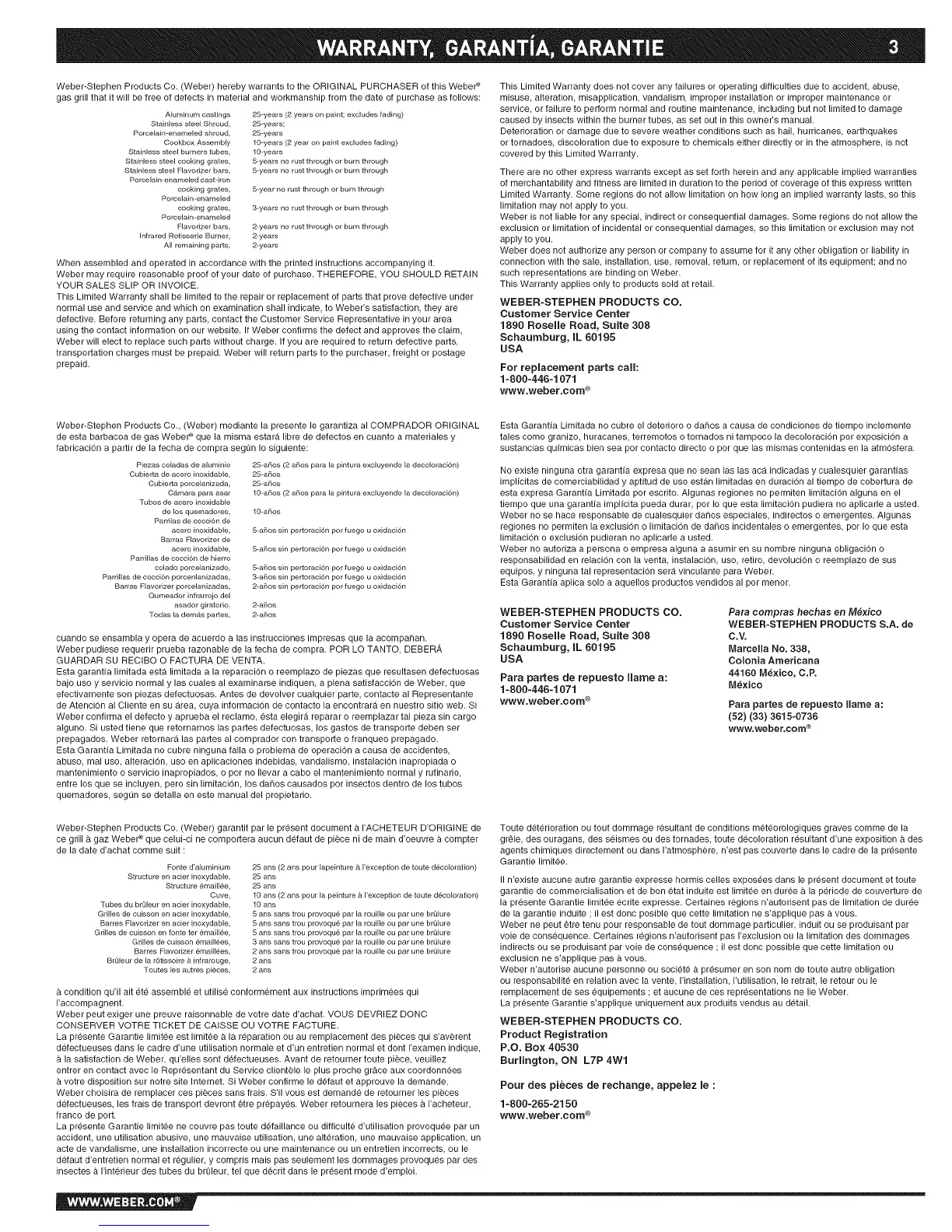 Weber choisira de remplacer ces pieces sans frais. S'il vous est demande de retourner les pieces