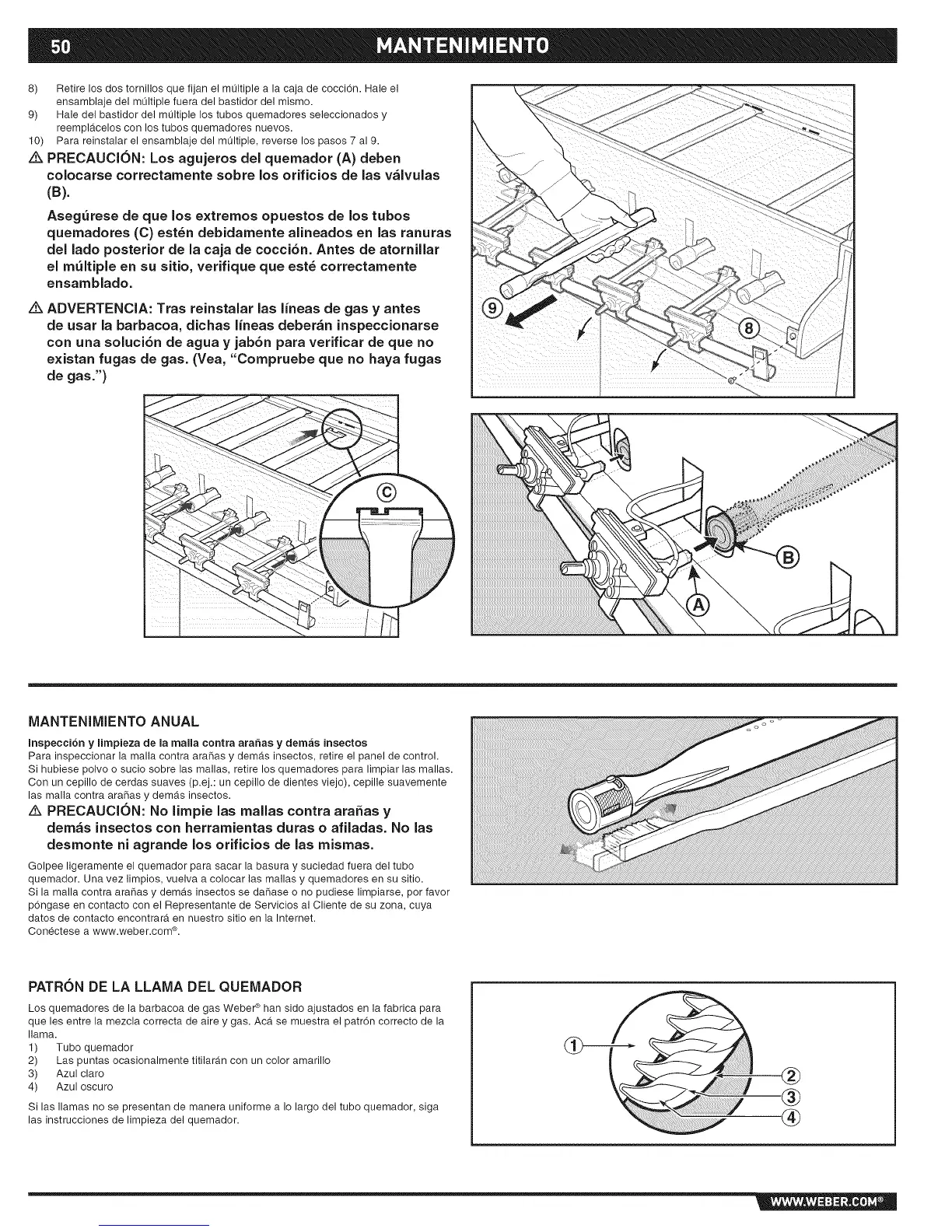 quemador. Una vez limpios, vuelva a colocar las mallas y quemadores en su sitio.