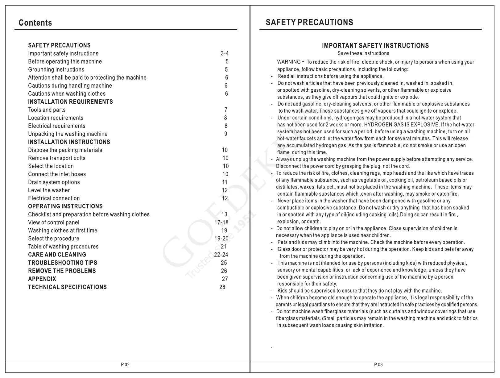 Summit SPWD2200 - Contents; Safety Precautions; Important Safety Instructions