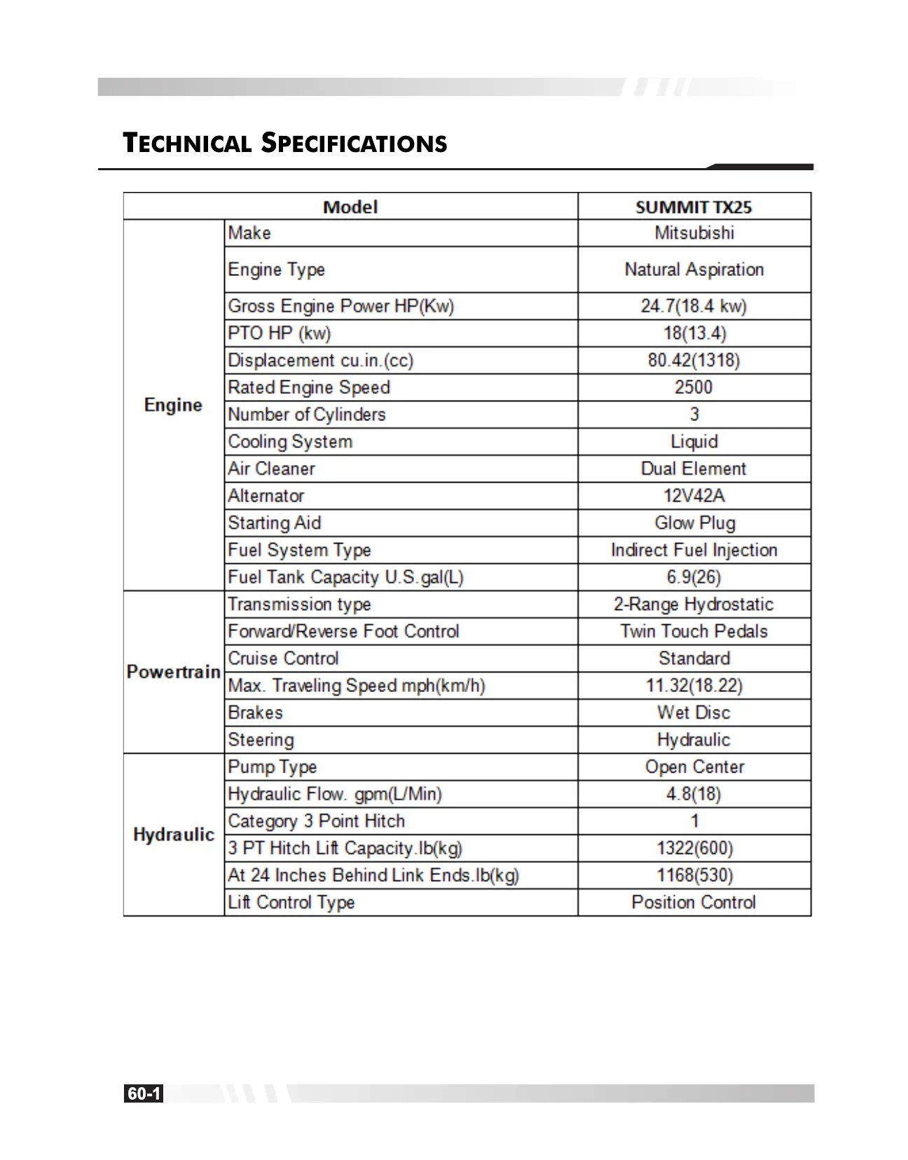 Summit TX25H - Technical Specifications; Engine and Powertrain Specifications; Hydraulic and Dimension Specifications