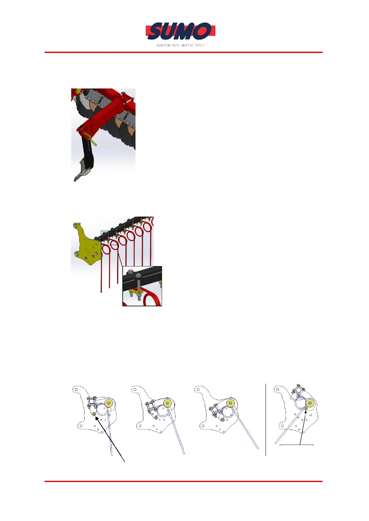 To adjust the height or angle of the Following Harrow, simply reposition the bolts
