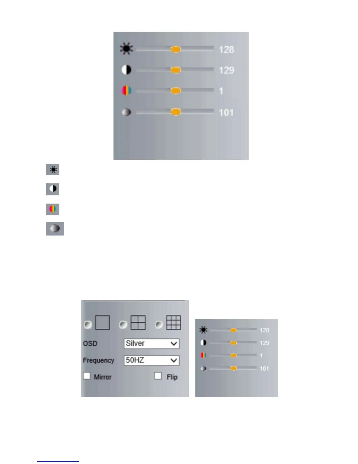 Contrast: set value from 0 to 255, click the icon, it will change back to the factory settings.