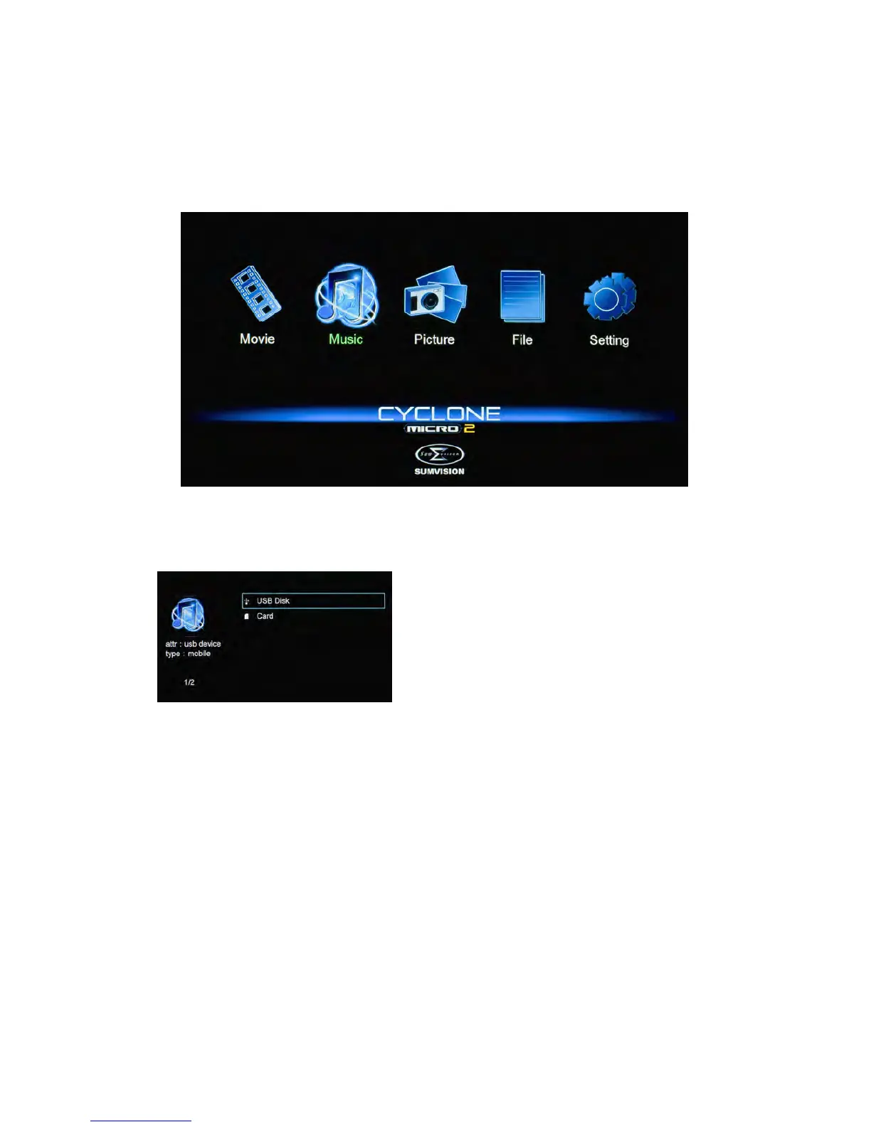 UsingtheCycloneMicro2remotecontrol,navigateto“Music”andpress