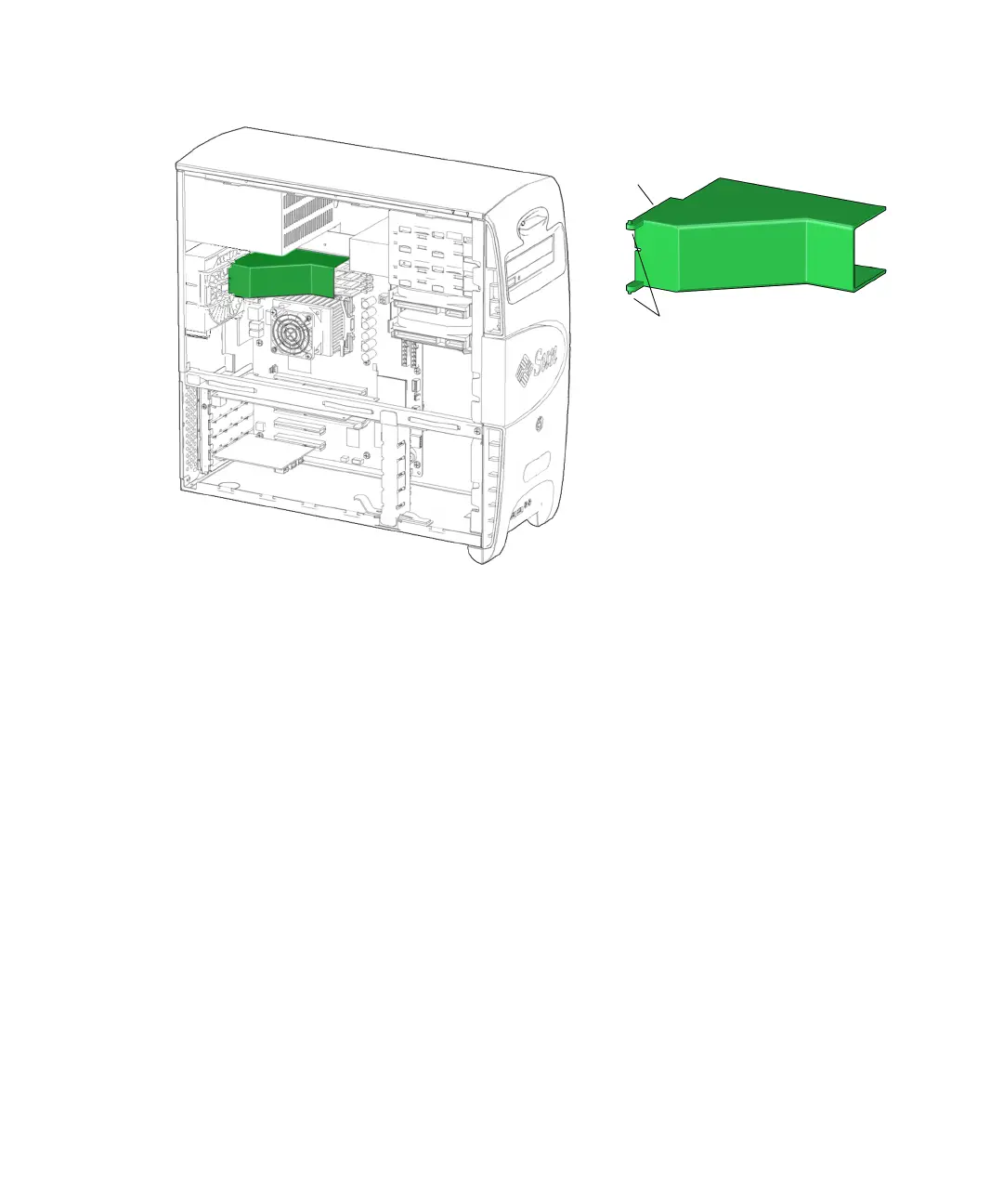 The DIMM cooling duct is secured to the rear fan bracket by guide rails formed in