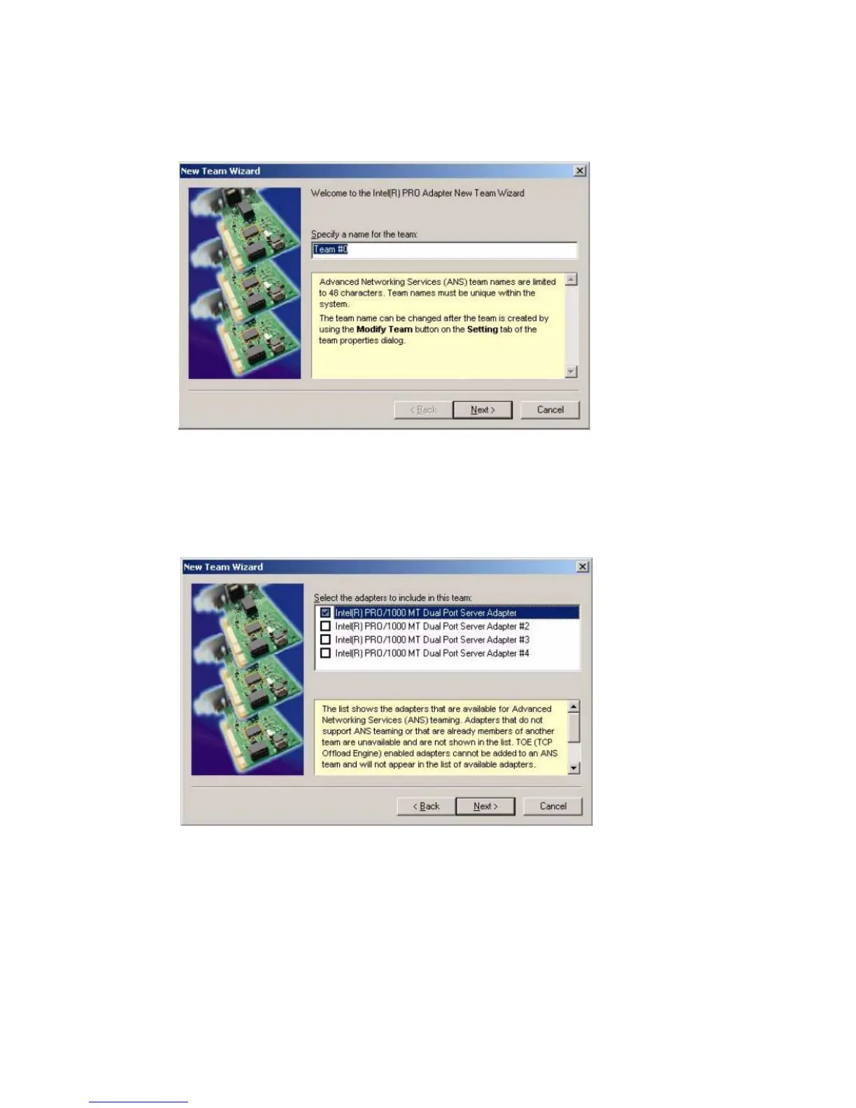 8. Select the adapters to be included in the team from the list of installed adapters