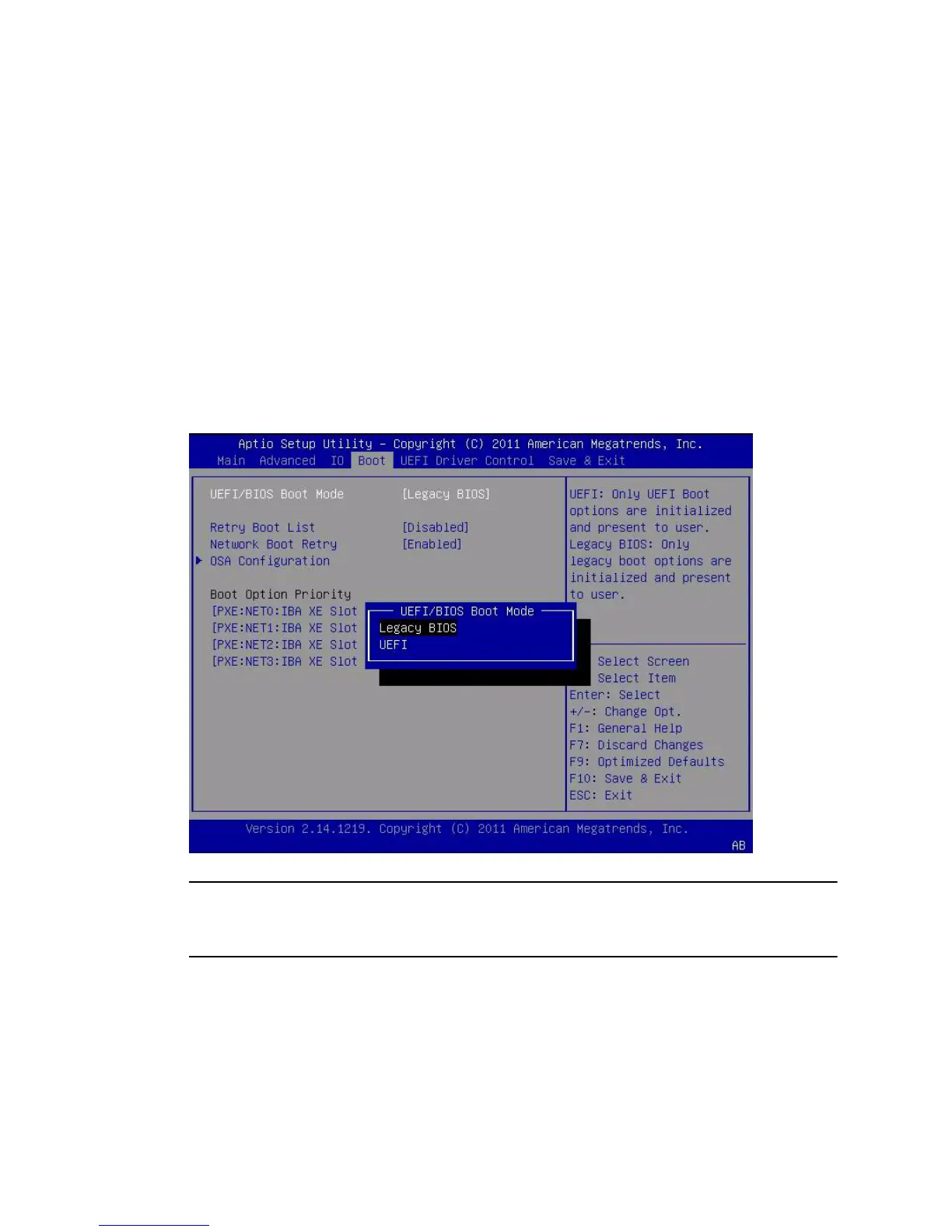 4. Use the up and down arrow keys to select the appropriate boot mode, and then
