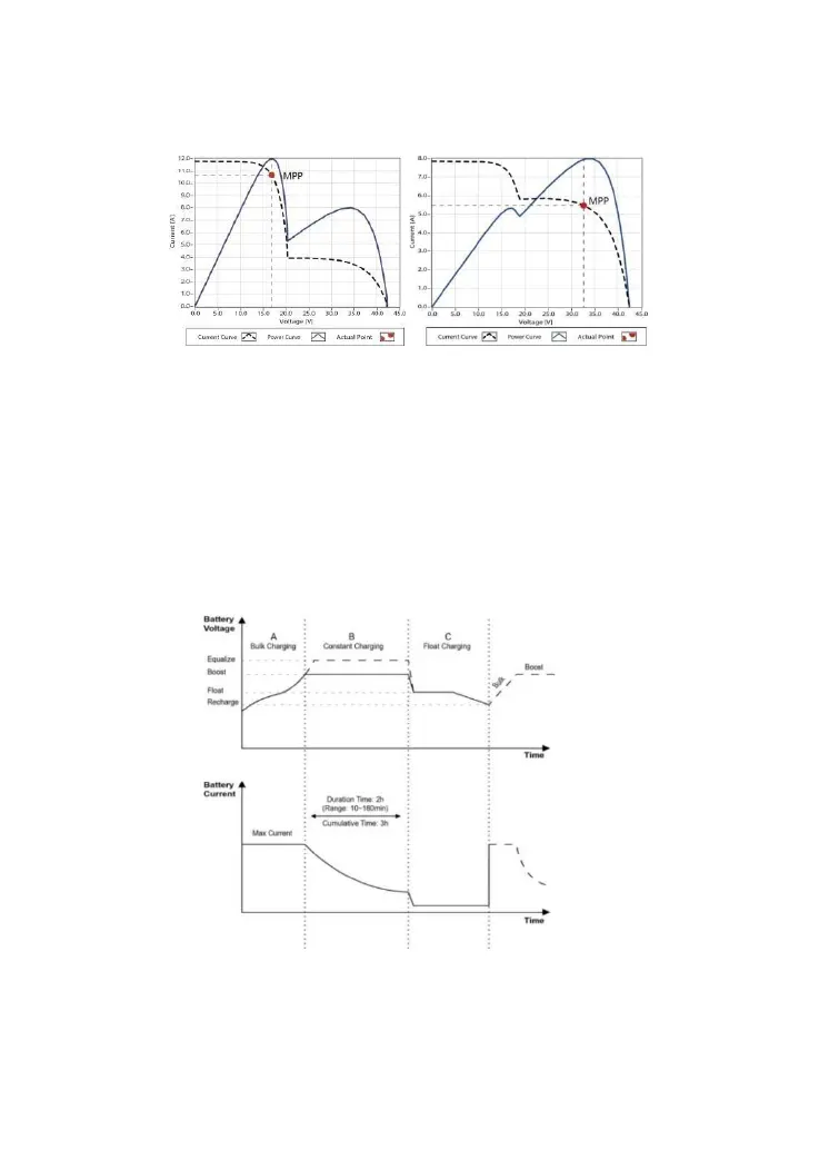 The controller has a 3 stages battery charging algorithm (Bulk Charging, Constant