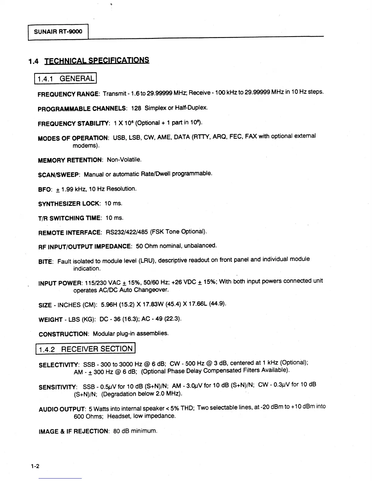 sunair RT-9000C - RT-9000 B Technical Specifications