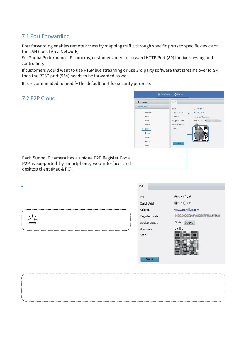 For Sunba Performance IP cameras, customers need to forward HTTP Port (80) for live viewing and