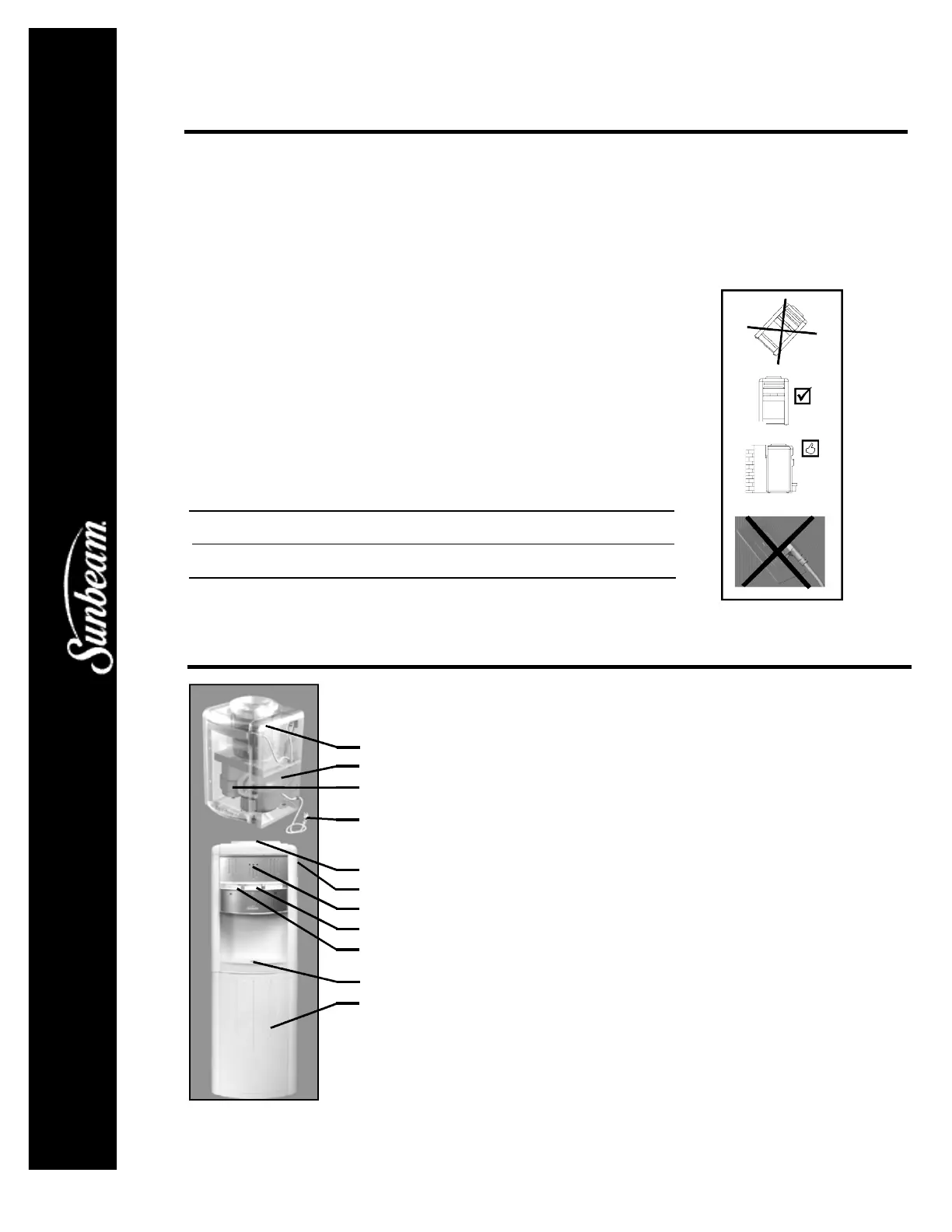 heat. Place the water dispenser on a level surface. The unit should be placed flatly. Make sure that there