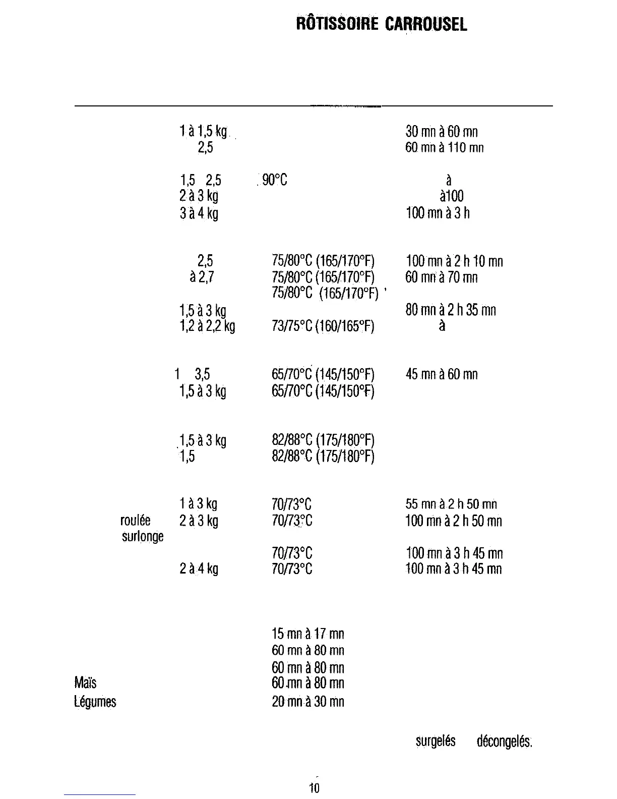 Les temps de cuisson figurant sur le tableau sont à partir d’aliments non ou