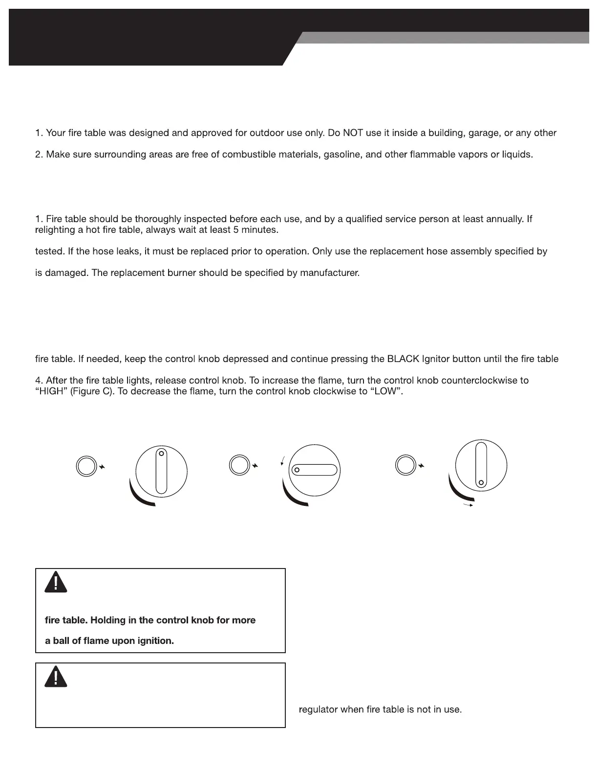3. Push in gas control knob, turn counterclockwise to “LOW” (Figure B), and press the BLACK Ignitor button to light the