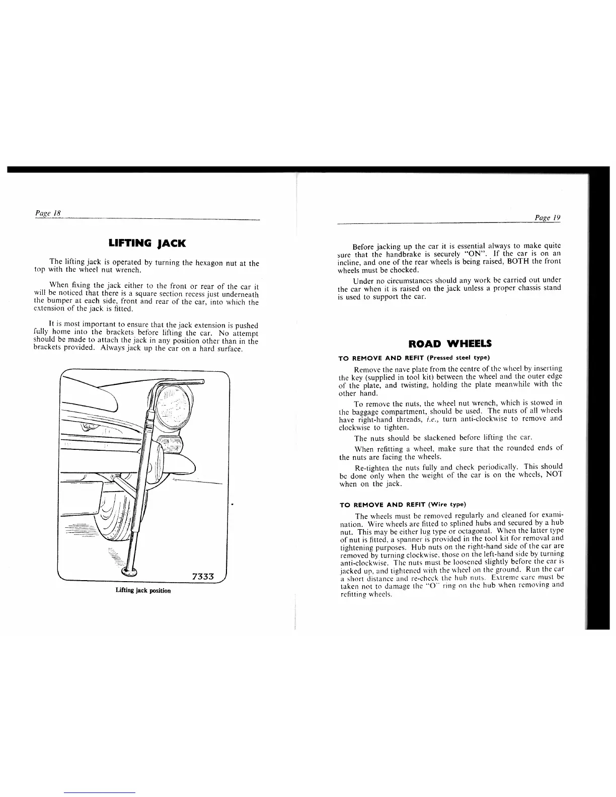Sunbeam Alpine V series - Lifting the Vehicle and Road Wheels; Lifting Jack Operation; Road Wheel Removal and Refitting