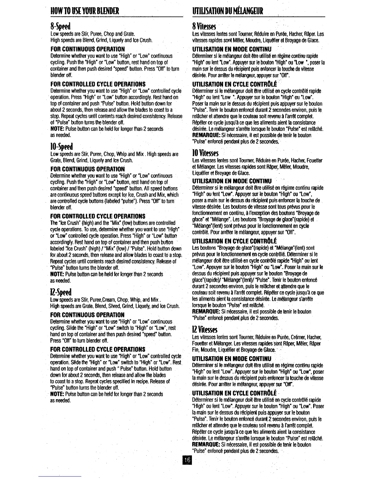 Sunbeam Blender - Using Your Osterizer Blender by Speed Setting; 8-Speed Operation Guide; 10-Speed Operation Guide; 12-Speed Operation Guide