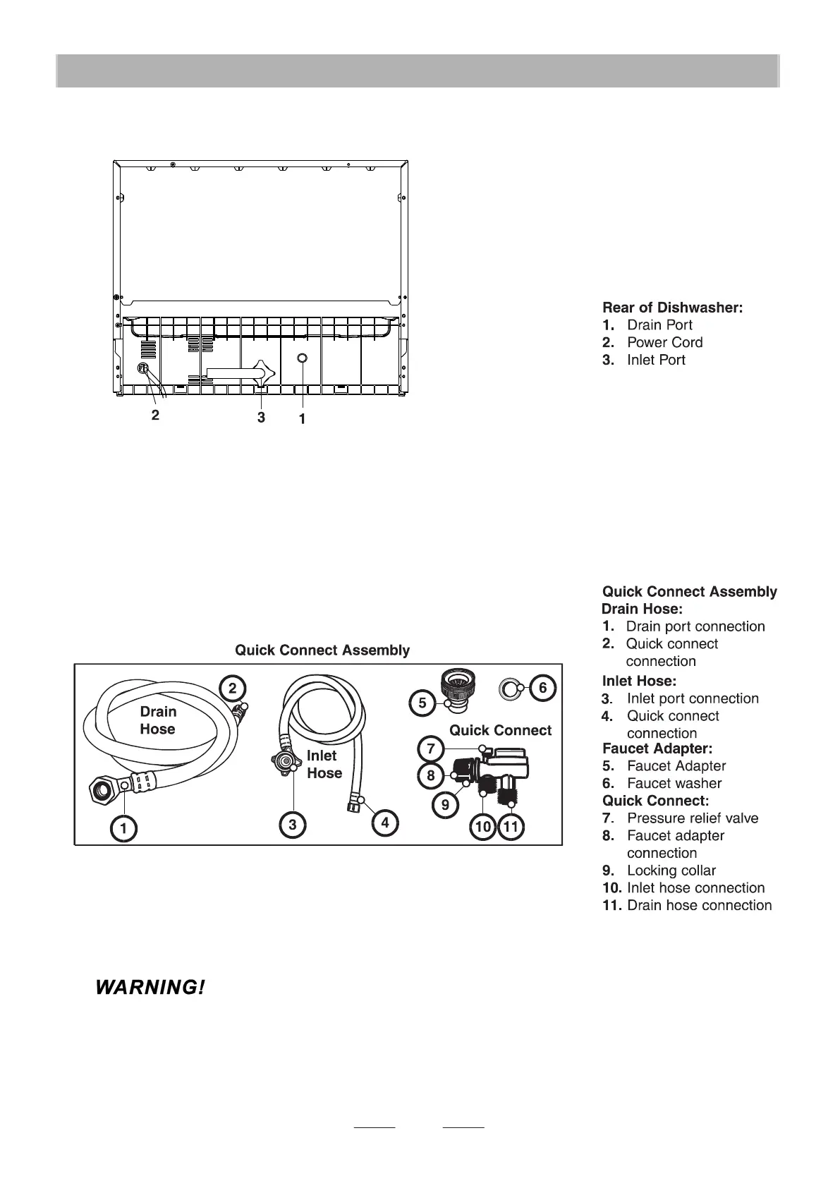 Your dishwasher comes equipped with a 'quick connect' assembly (includes inlet and drain hose). The