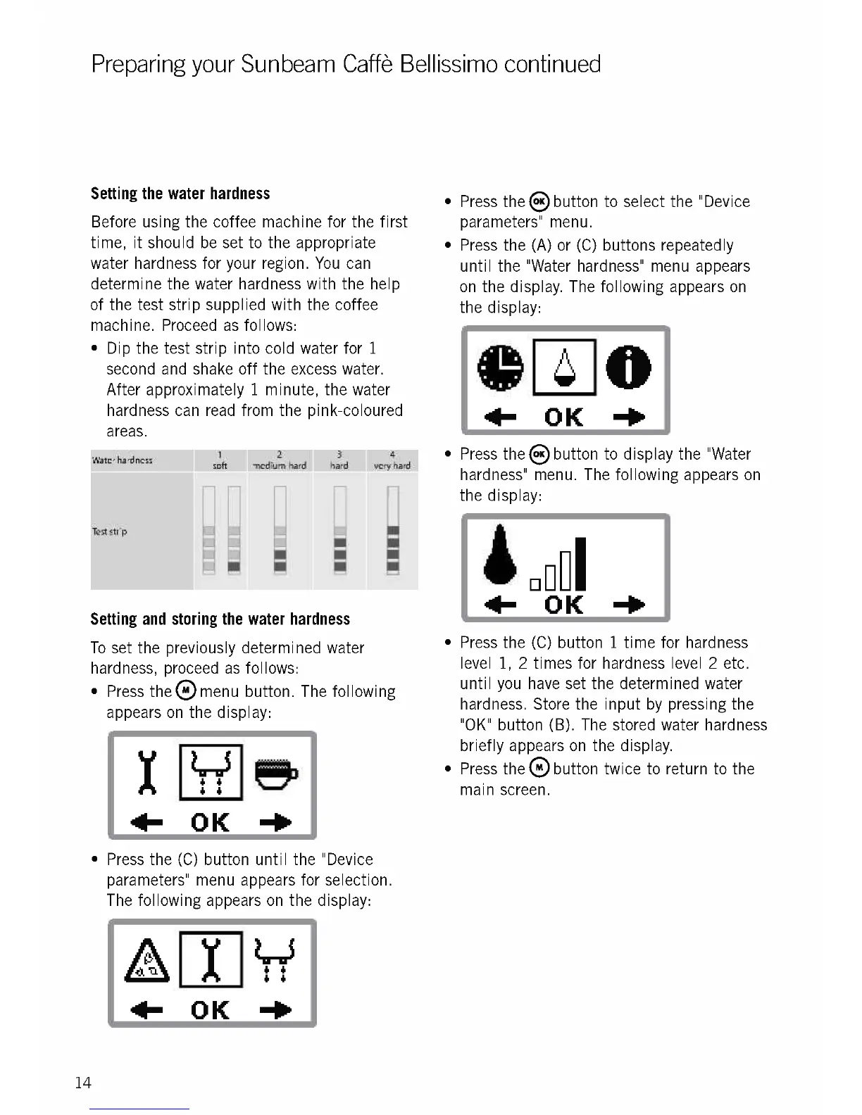 "OK" button (B). The stored water hardness