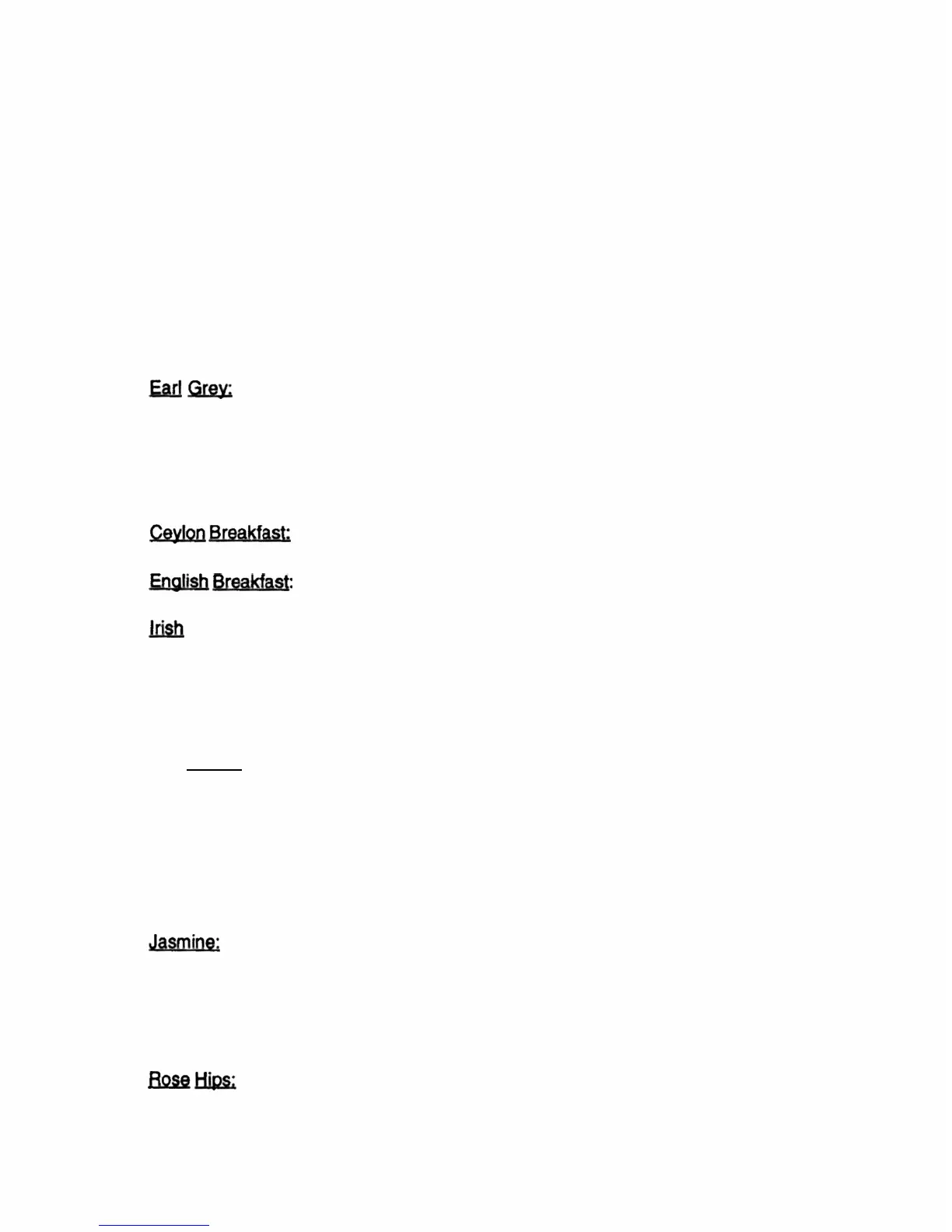 Darjeelijng, Ceylon Breakfast, English Breakfast, Irish Breakfast, Keemun and Yunnan.