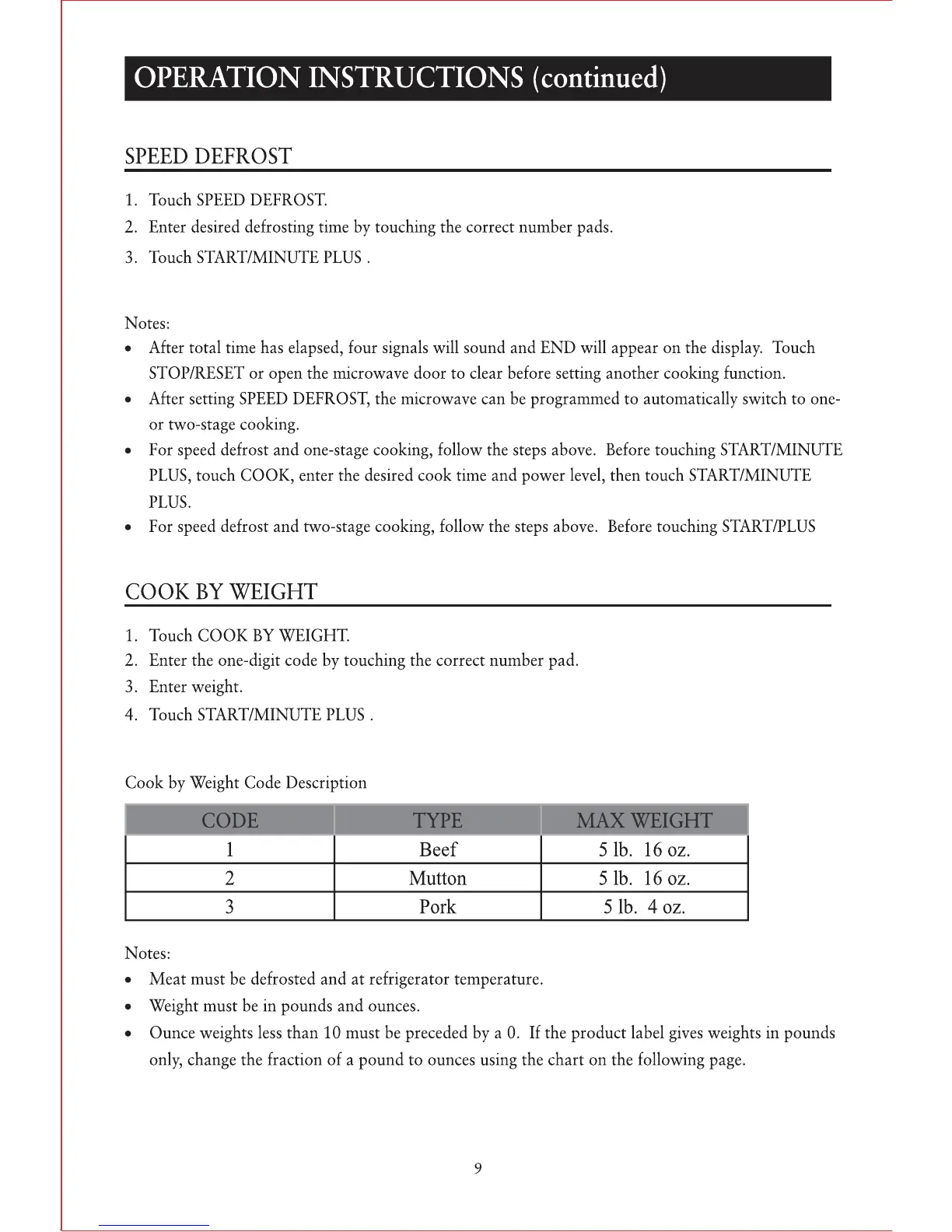 Sunbeam SM0701A7E - Operation Instructions (continued); Speed Defrost Function; Cook by Weight